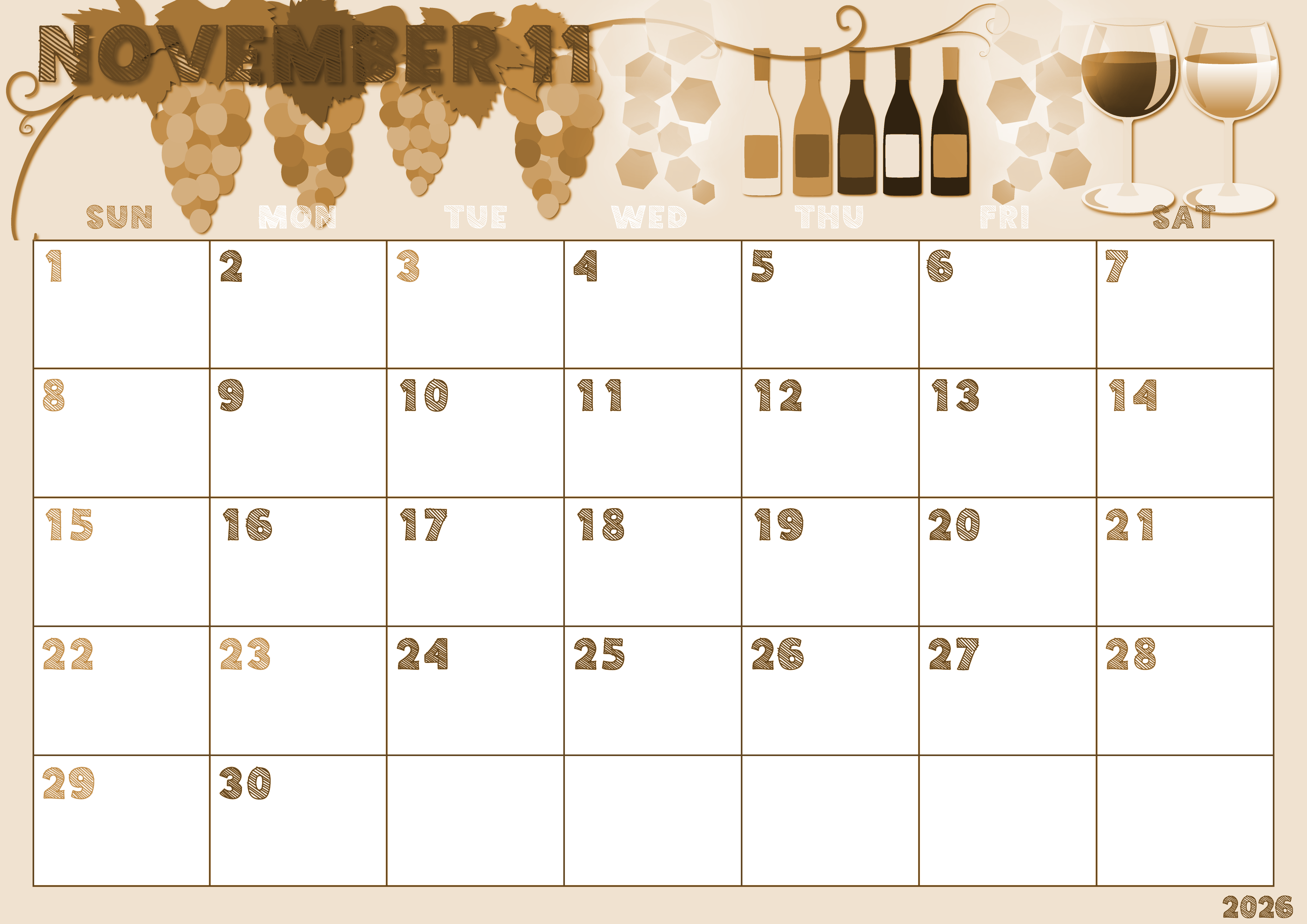2026年11月横型レトロな日曜始まりの無料テンプレートセピア調カレンダーです。マスカットやグレープがたわわに実っていて赤ワインと白ワインも並べられている大人かわいいデザインのイラストとなっています。(2026-00691100)
