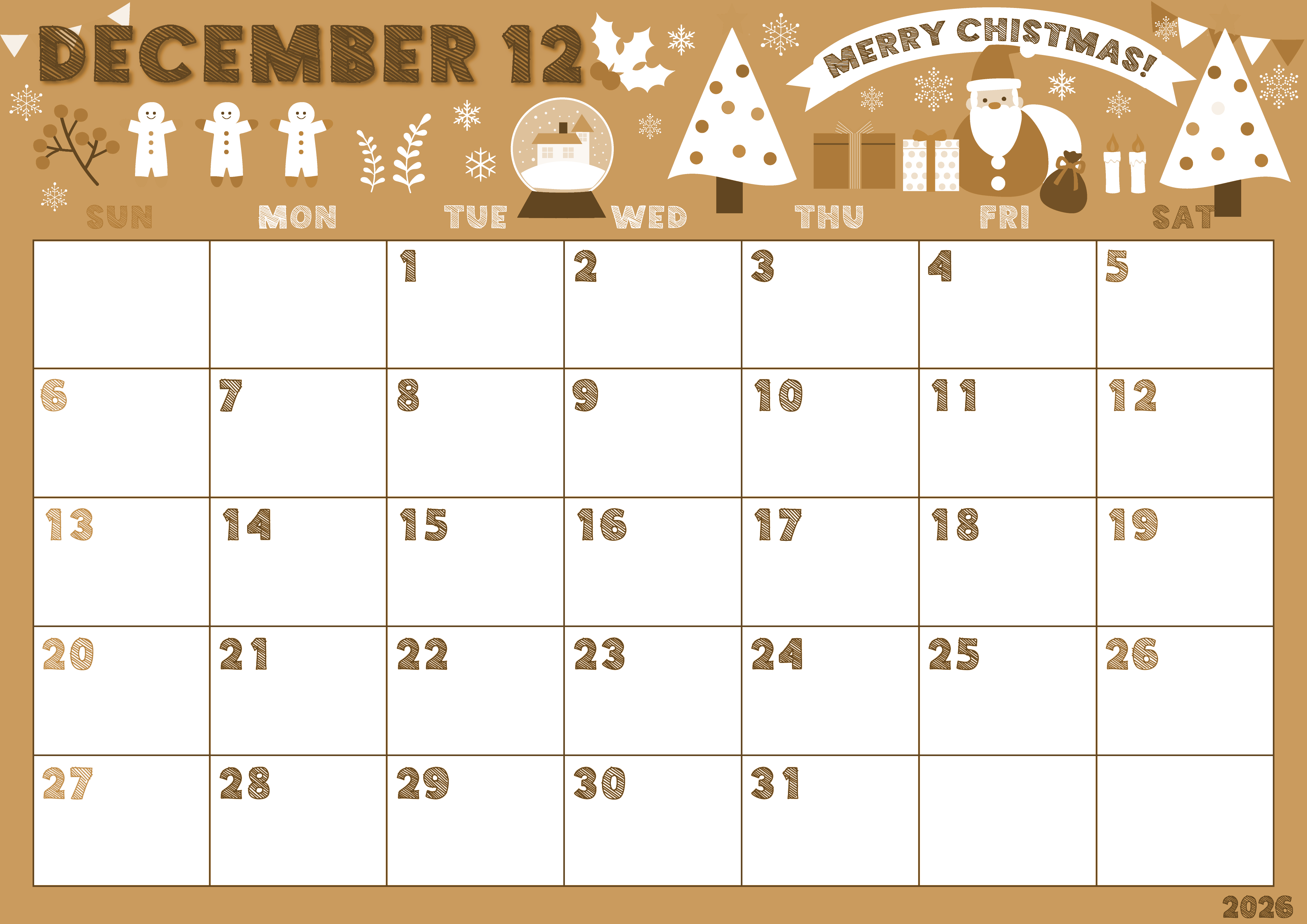 2026年12月横型レトロな日曜始まりの無料テンプレートセピア調カレンダーです。ポップに季節の行事を元気いっぱいに描いたかわいいイラストです。文字部分もかすれたように色塗りがされているデザインでどこまでもかわいいです。(2026-00691200)