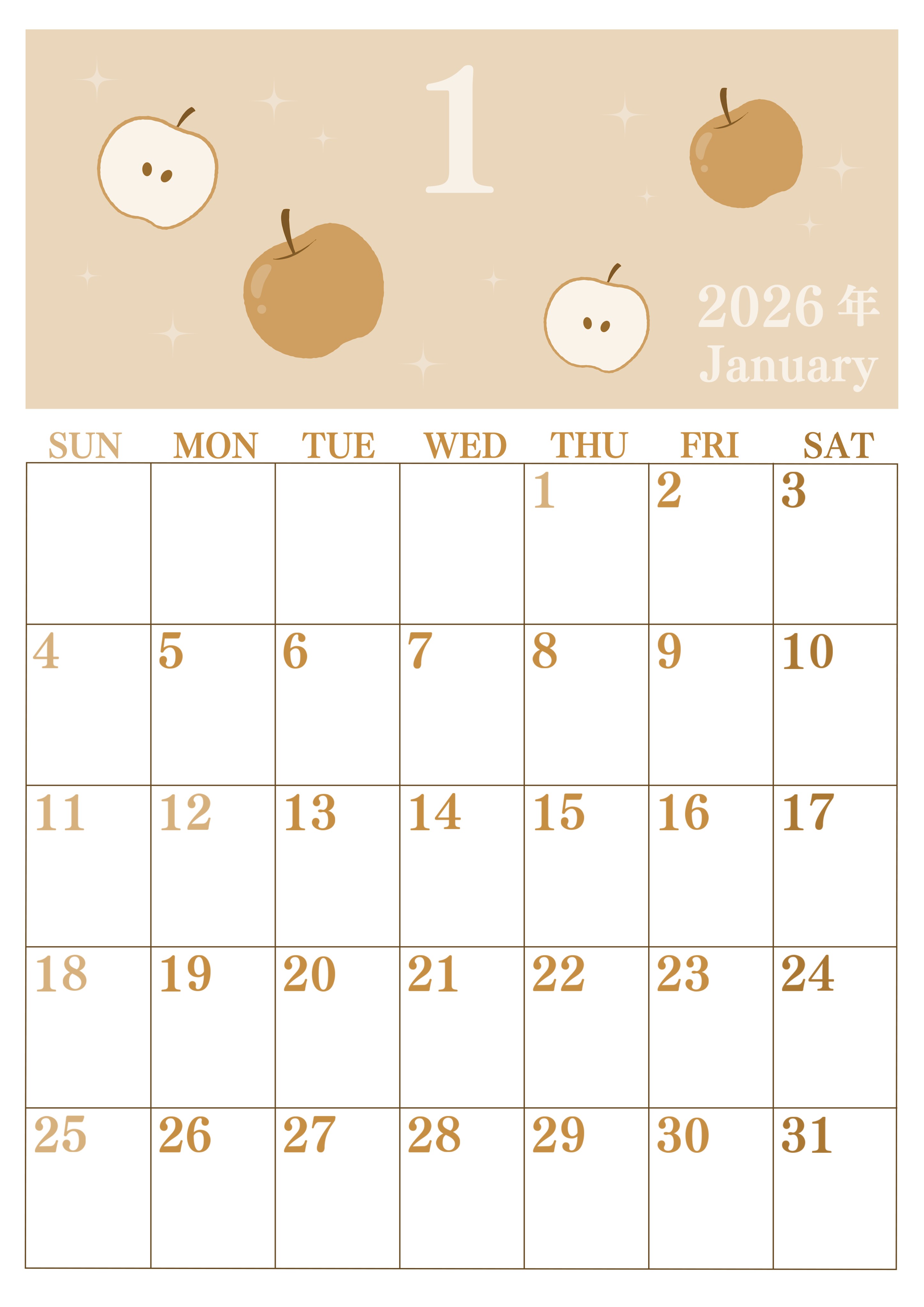 2026年1月縦型レトロな日曜始まり 大きいりんごイラストのかわいいA4無料セピア調カレンダー(2026-00700110)