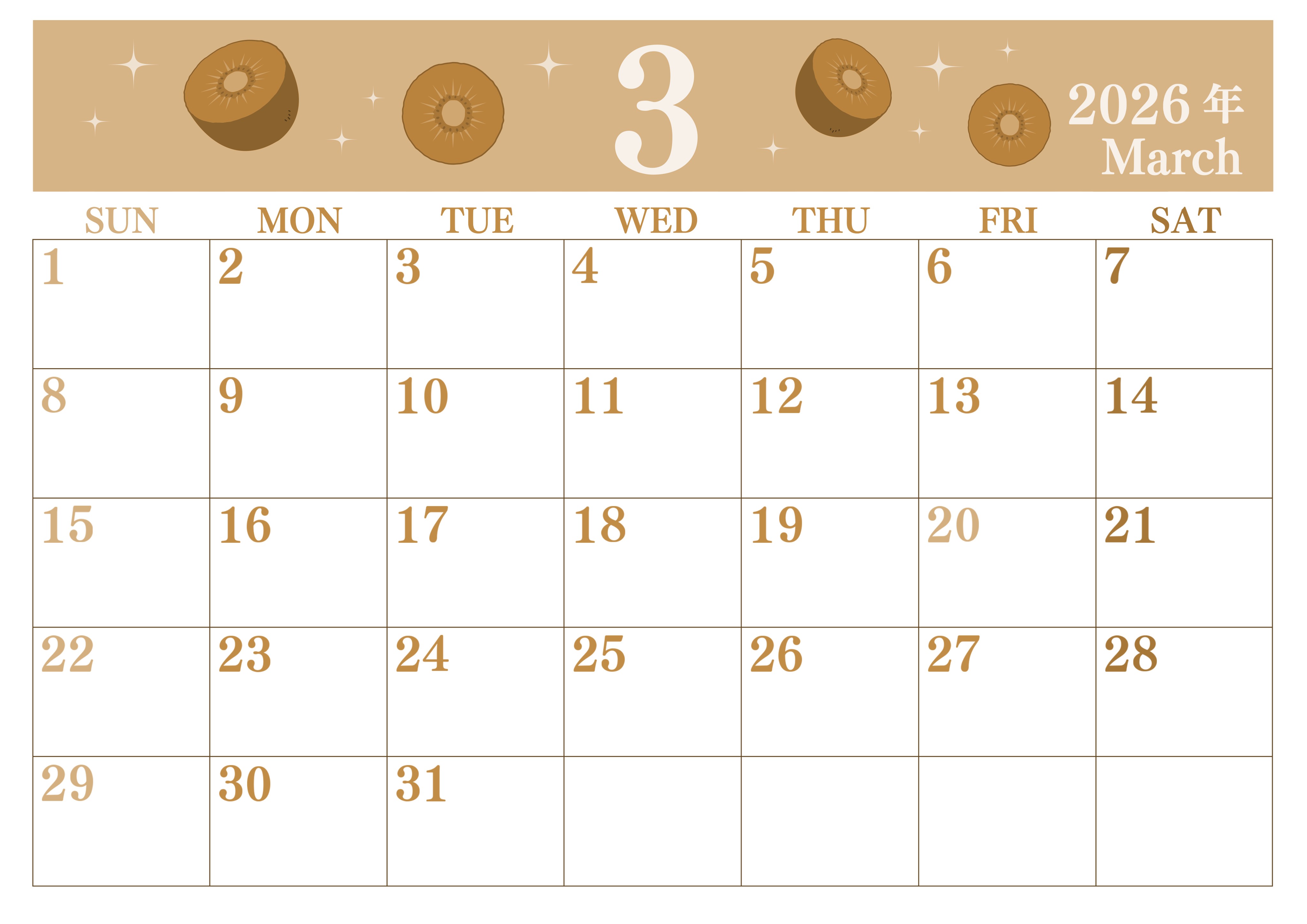 2026年・無料のカレンダーテンプレート 2026年3月横型レトロな日曜始まり キウイのかわいいイラストA4無料セピア調カレンダー(2026-00700300) 素材状デザイン王 2025年4月2日 2026年3月横型レトロな日曜始まりの無料テンプレートセピア調カレンダーです。シックな背景にみずみずしいキウイのイラストがフルーティでかわいいイラストセピア調カレンダーとなっています。(2026-00700300) 3月 横型のカレンダー 日曜始まり セピア カレンダーデザイン-0070