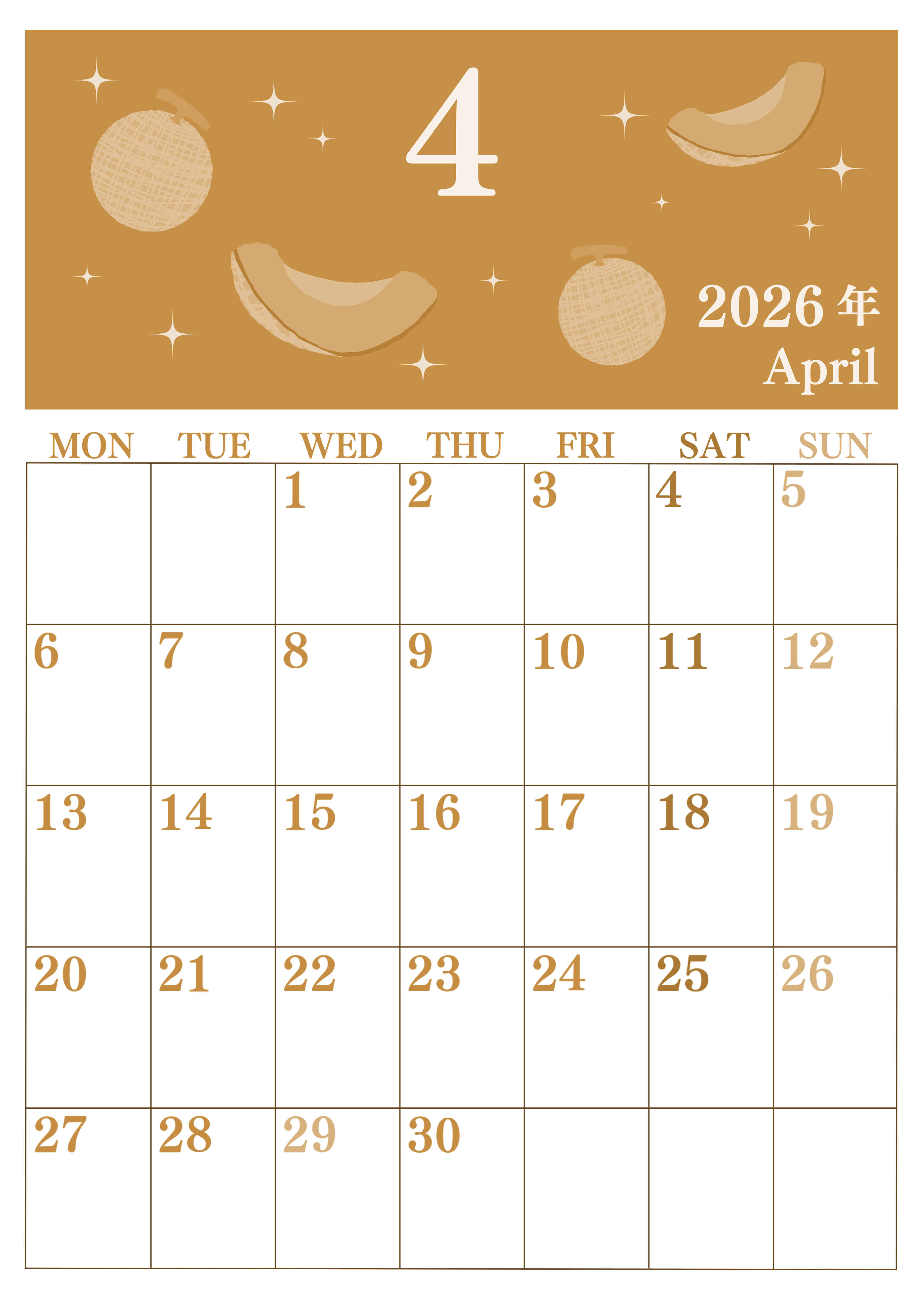 2026年4月縦型レトロな月曜始まりの無料テンプレートセピア調カレンダーです。かわいいメロンたちがちりばめられているイラストがチャームポイントの縦型で曜日ごとに文字の色分けがされている見やすい無料セピア調カレンダーです。(2026-00700411)