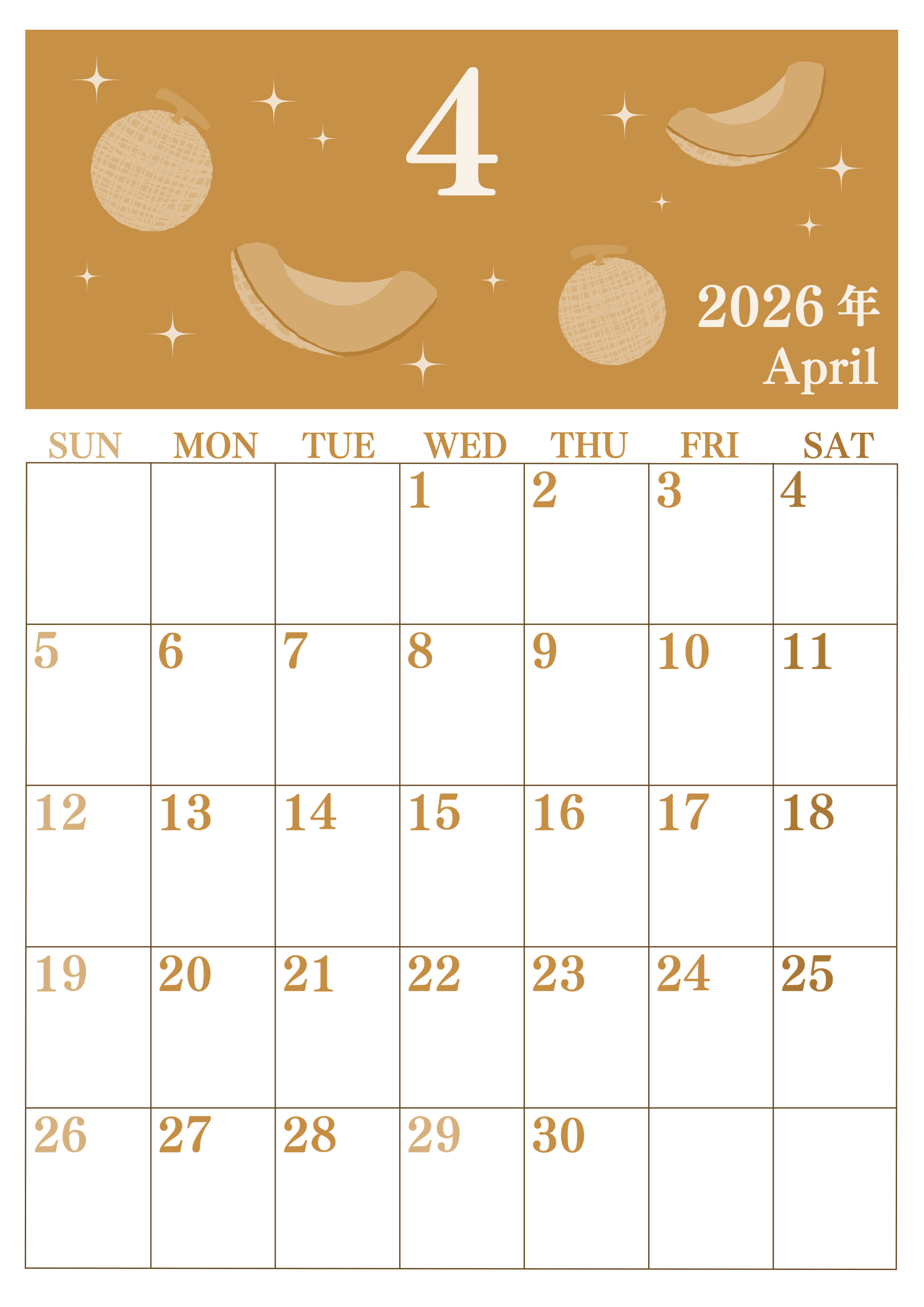 2026年4月縦型レトロな日曜始まりの無料テンプレートセピア調カレンダーです。メロンが存在感のあるかわいいセピア調カレンダーです。イラスト部分は少なめに、スケジュールを書き込む部分は大きめに確保してあるので実用的です。(2026-00700410)
