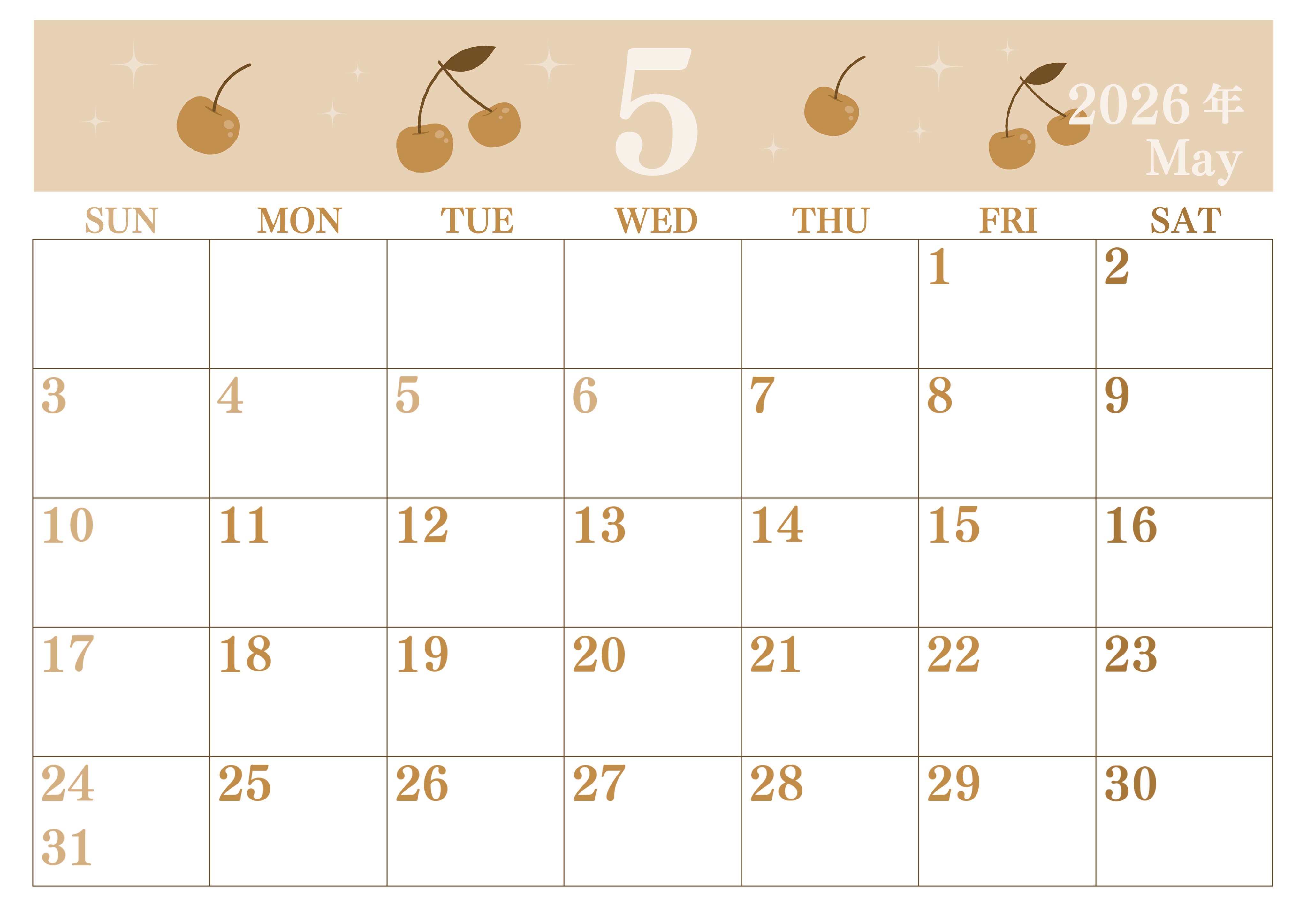 2026年・無料のカレンダーテンプレート 2026年5月横型レトロな日曜始まり さくらんぼイラストのかわいいA4無料セピア調カレンダー(2026-00700500) 素材状デザイン王 2025年4月2日 2026年5月横型レトロな日曜始まりの無料テンプレートセピア調カレンダーです。背景にプリプリのさくらんぼがちりばめられているかわいいイラストのセピア調カレンダーです。さくらんぼが輝いています。(2026-00700500) 5月 横型のカレンダー 日曜始まり セピア カレンダーデザイン-0070