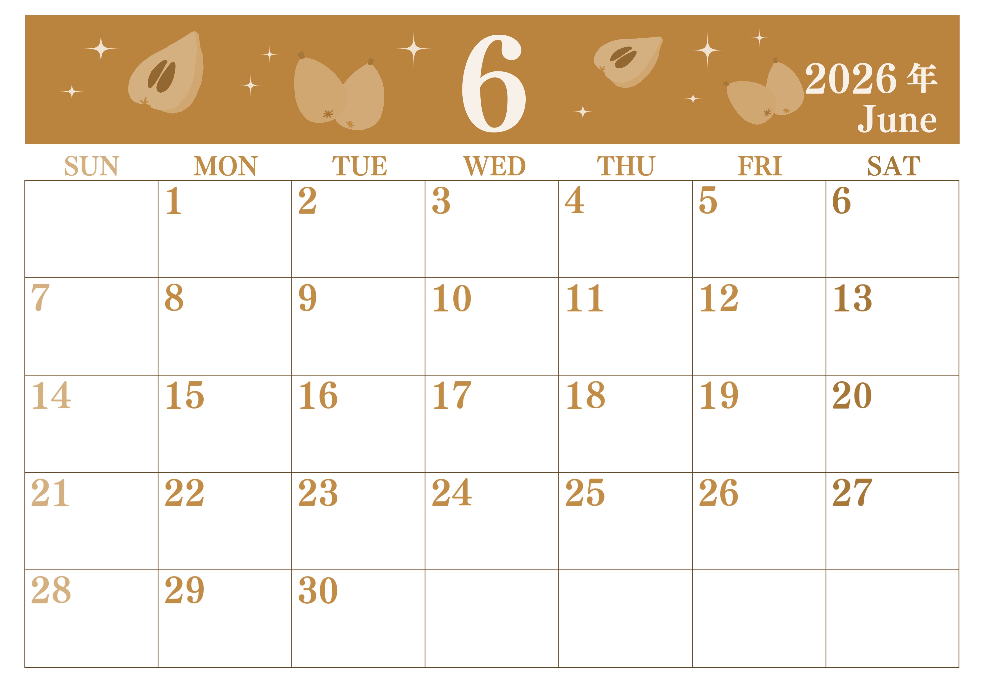2026年6月横型レトロな日曜始まりの無料テンプレートセピア調カレンダーです。背景にびわのイラストが落ち着いていてかわいいイラストセピア調カレンダーです。罫線が引かれているので利便性が高いです。(2026-00700600)