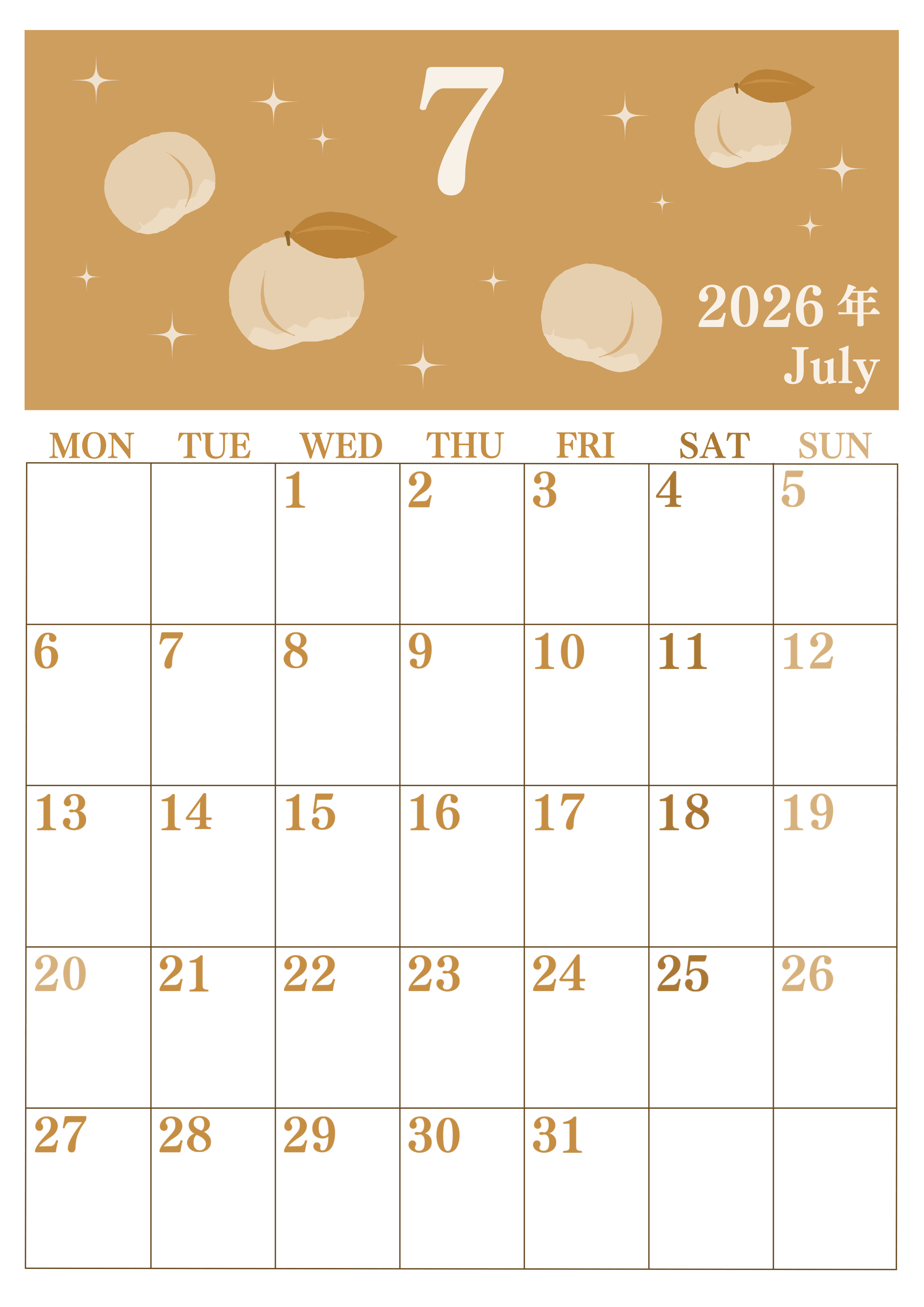 2026年・無料のカレンダーテンプレート 2026年7月縦型レトロな月曜始まり 桃のイラストがかわいいA4無料セピア調カレンダー(2026-00700711) 素材状デザイン王 2025年4月2日 2026年7月縦型レトロな月曜始まりの無料テンプレートセピア調カレンダーです。桃のイラストがおいしそうでかわいいデザインです。セピア調カレンダー部分は余白がたっぷりなので書き込みしやすいです。(2026-00700711) 7月 縦型のカレンダー 月曜始まり セピア カレンダーデザイン-0070