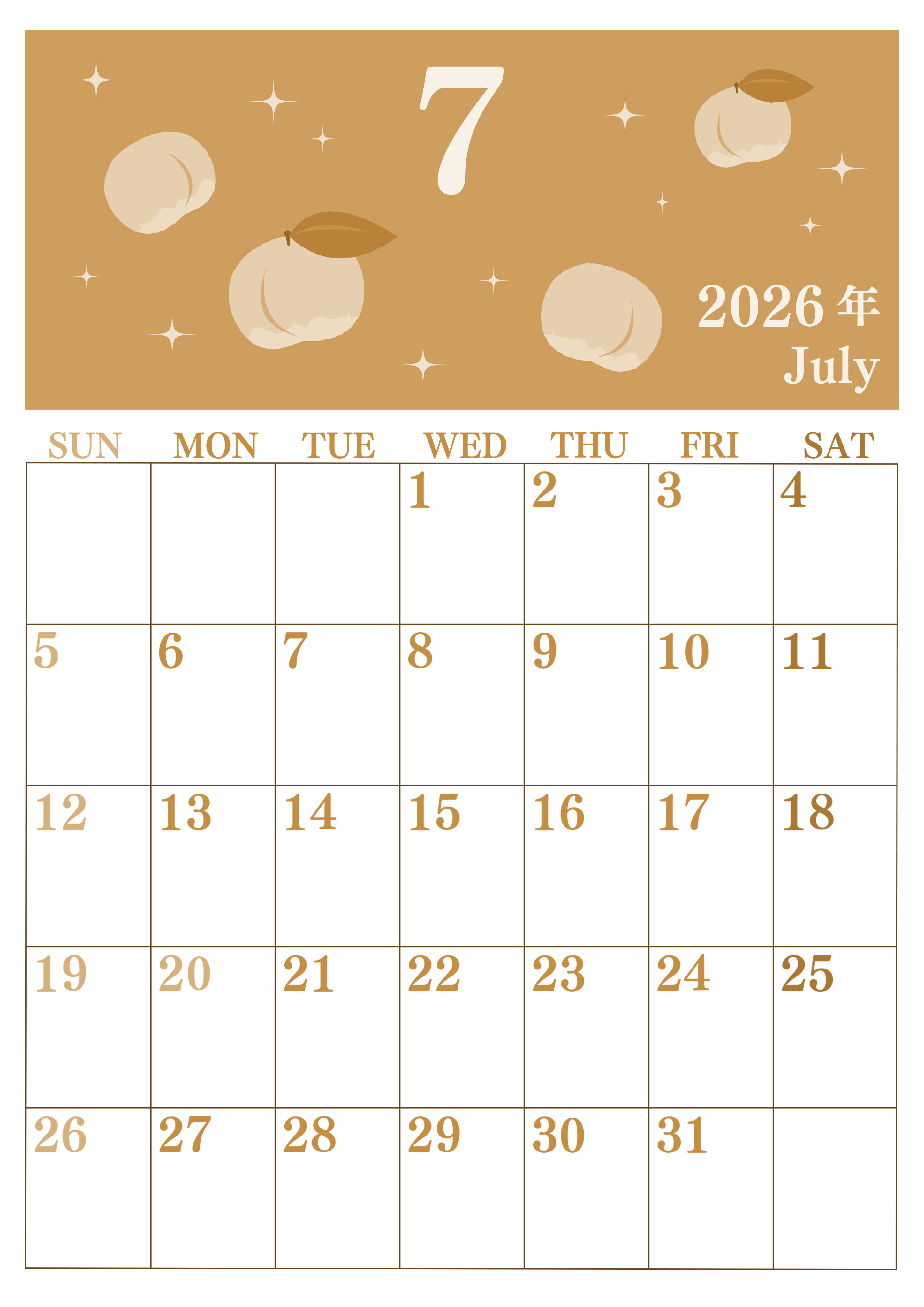 2026年7月縦型レトロな日曜始まりの無料テンプレートセピア調カレンダーです。縦向きでA4サイズなので壁に貼るのにちょうどいい大きさのセピア調カレンダーです。イラストは桃をメインテーマに取り上げていてみずみずしくかわいいです。(2026-00700710)