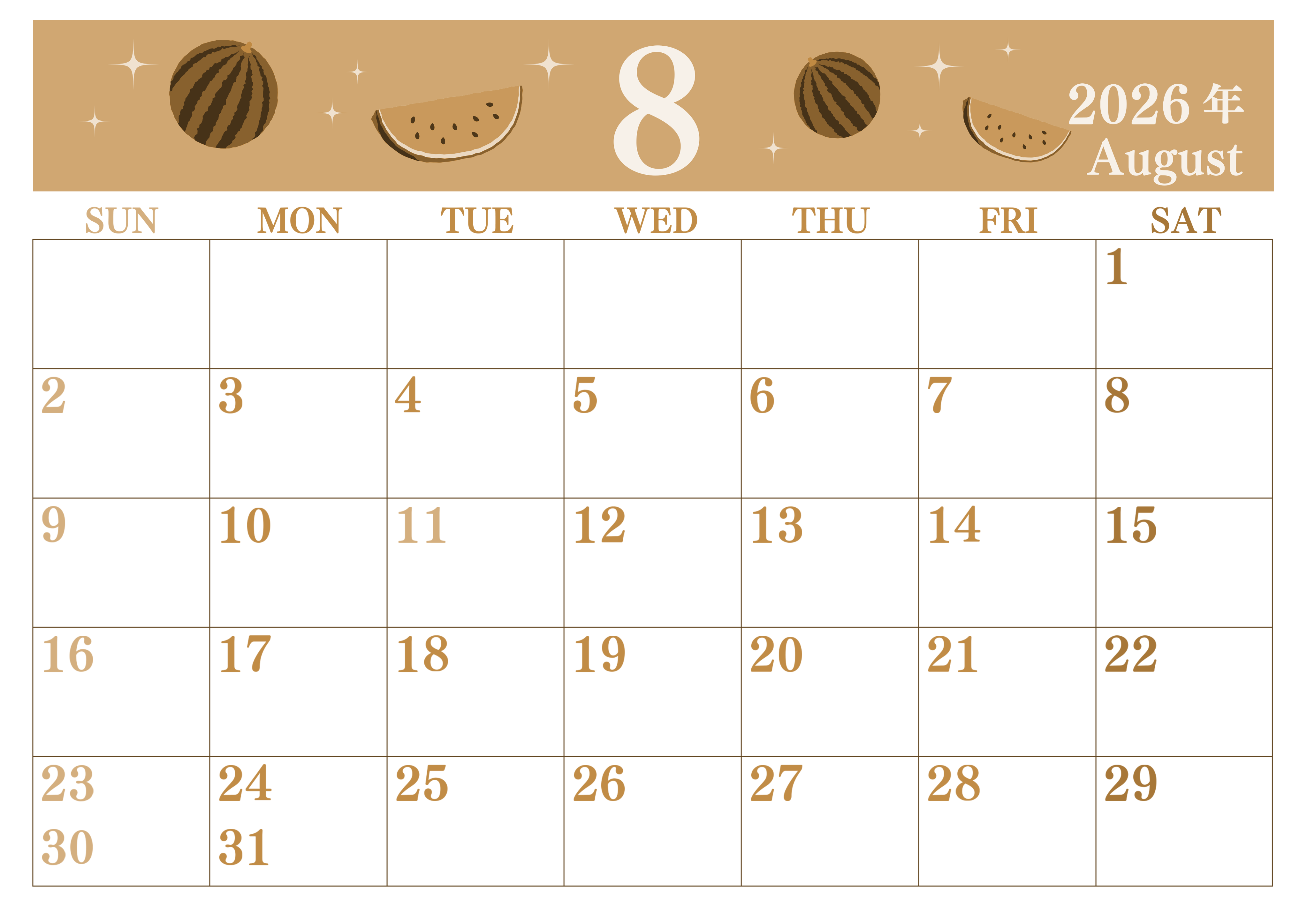 2026年・無料のカレンダーテンプレート 2026年8月横型レトロな日曜始まり 西瓜イラストのかわいいA4無料セピア調カレンダー(2026-00700800) 素材状デザイン王 2025年4月2日 2026年8月横型レトロな日曜始まりの無料テンプレートセピア調カレンダーです。キレイな西瓜がキラキラと輝いているかわいいイラストが上部にたっぷり描かれている無料で使えるセピア調カレンダーです。(2026-00700800) 8月 横型のカレンダー 日曜始まり セピア カレンダーデザイン-0070
