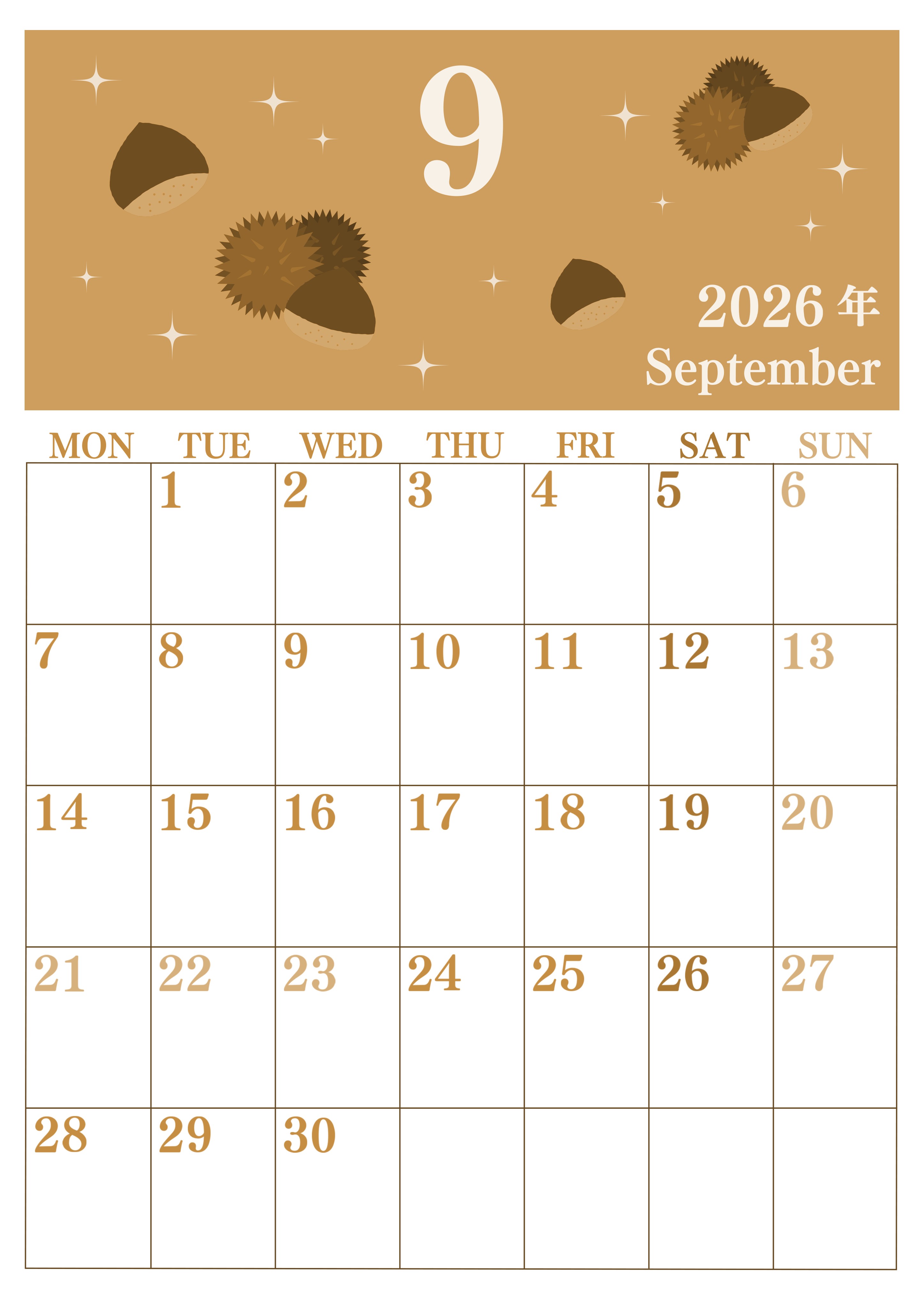 2026年9月縦型レトロな月曜始まり 栗イラストのかわいいA4無料セピア調カレンダー(2026-00700911)