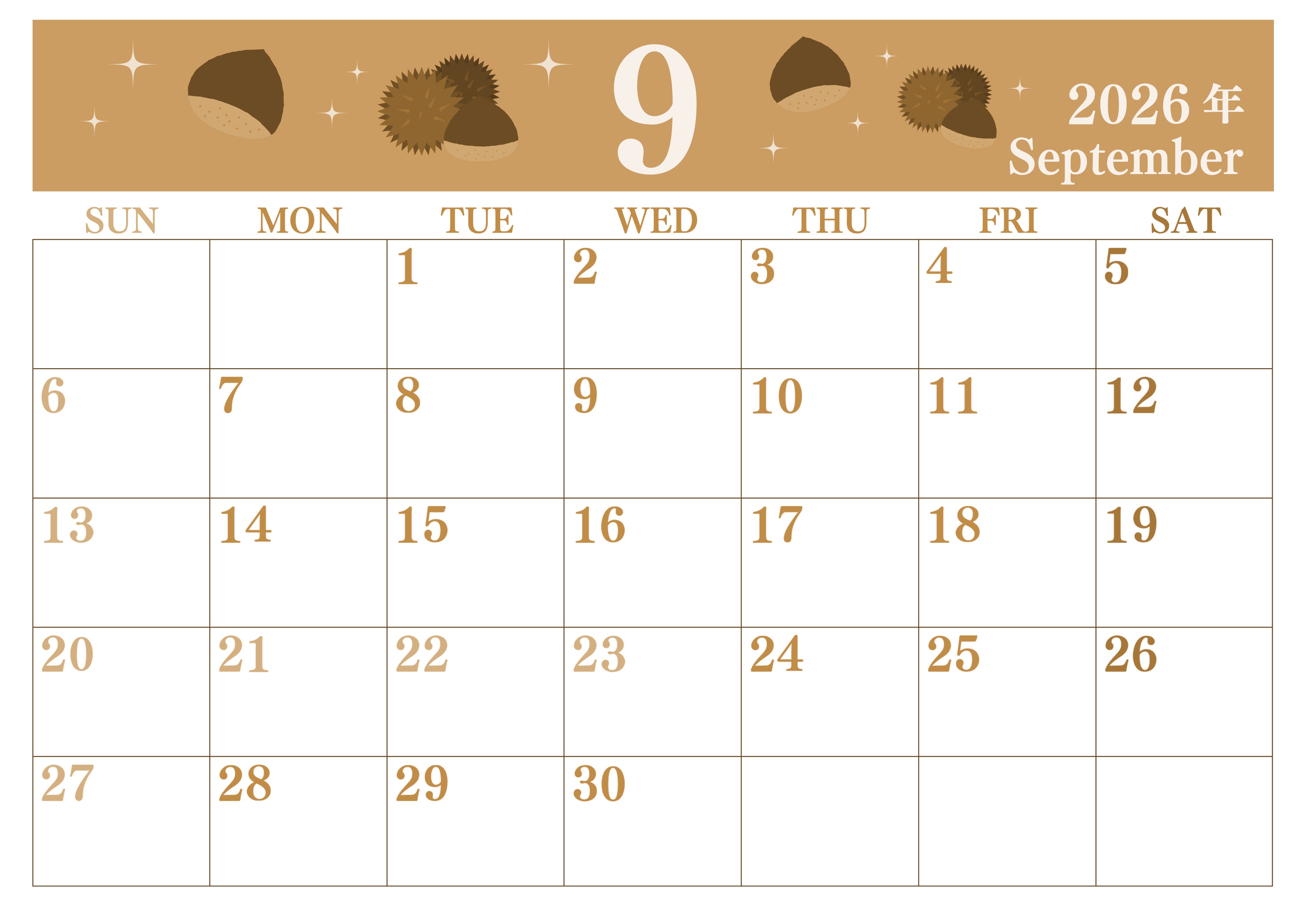 2026年9月横型レトロな日曜始まり 栗イラストのかわいいA4無料セピア調カレンダー(2026-00700900)