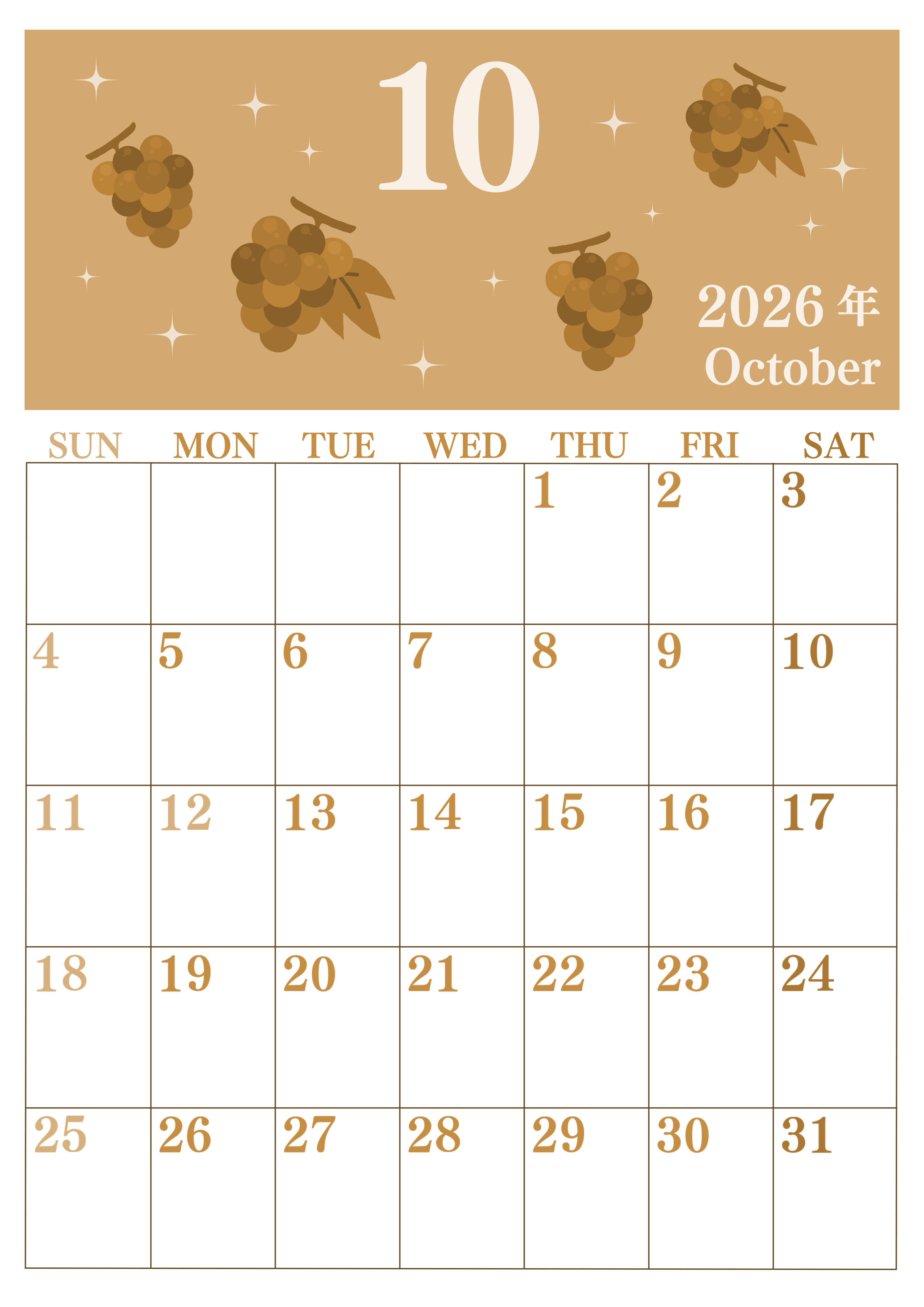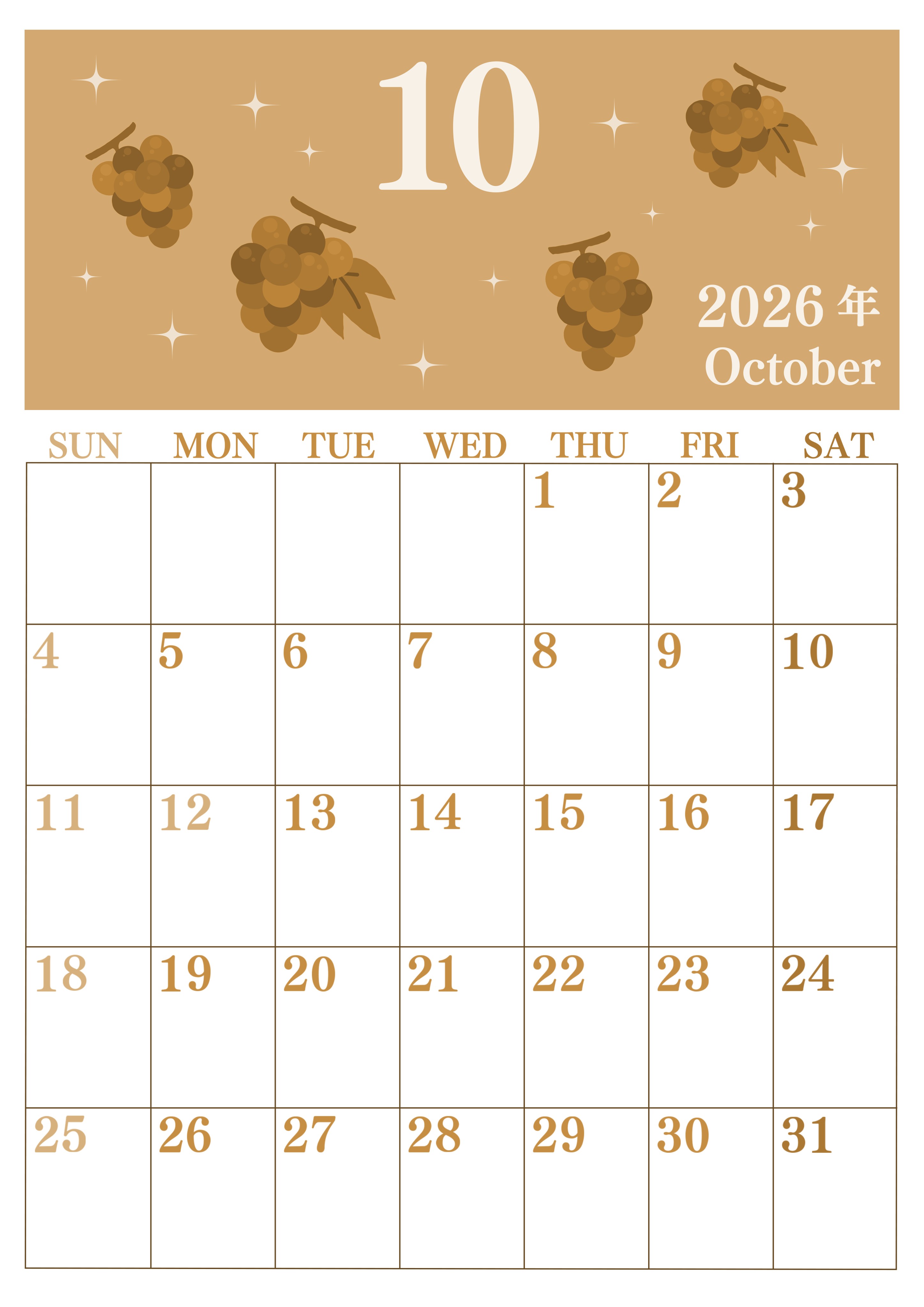 2026年10月縦型レトロな日曜始まり フルーツのイラストがかわいいA4無料セピア調カレンダー(2026-00701010)