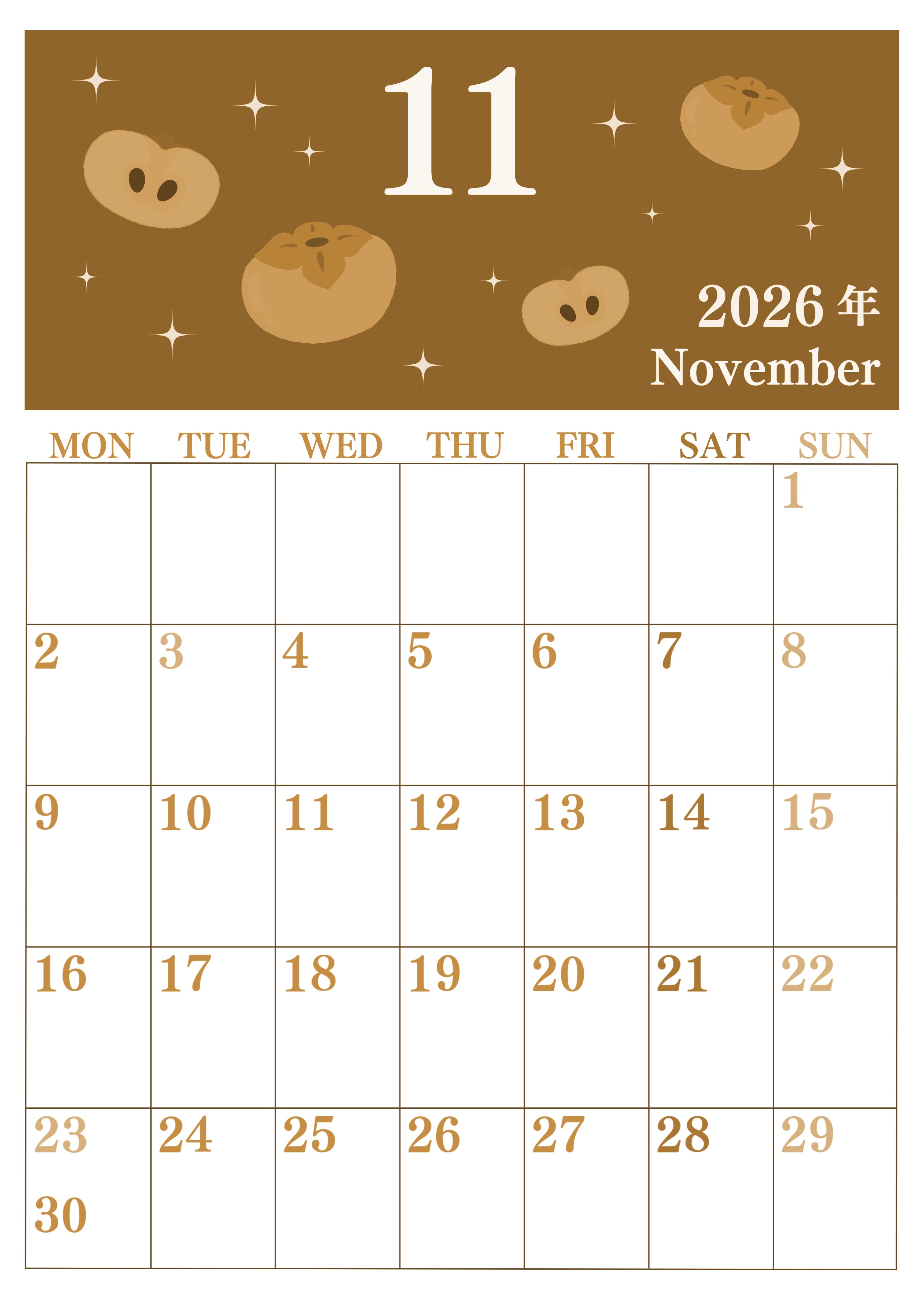 2026年・無料のカレンダーテンプレート 2026年11月縦型レトロな月曜始まり 柿イラストのかわいいA4無料セピア調カレンダー(2026-00701111) 素材状デザイン王 2025年4月2日 2026年11月縦型レトロな月曜始まりの無料テンプレートセピア調カレンダーです。はっきりとしていてかわいいです。イラストだけでなくセピア調カレンダーの余白もたっぷりしているので実用性が高いです。(2026-00701111) 11月 縦型のカレンダー 月曜始まり セピア カレンダーデザイン-0070