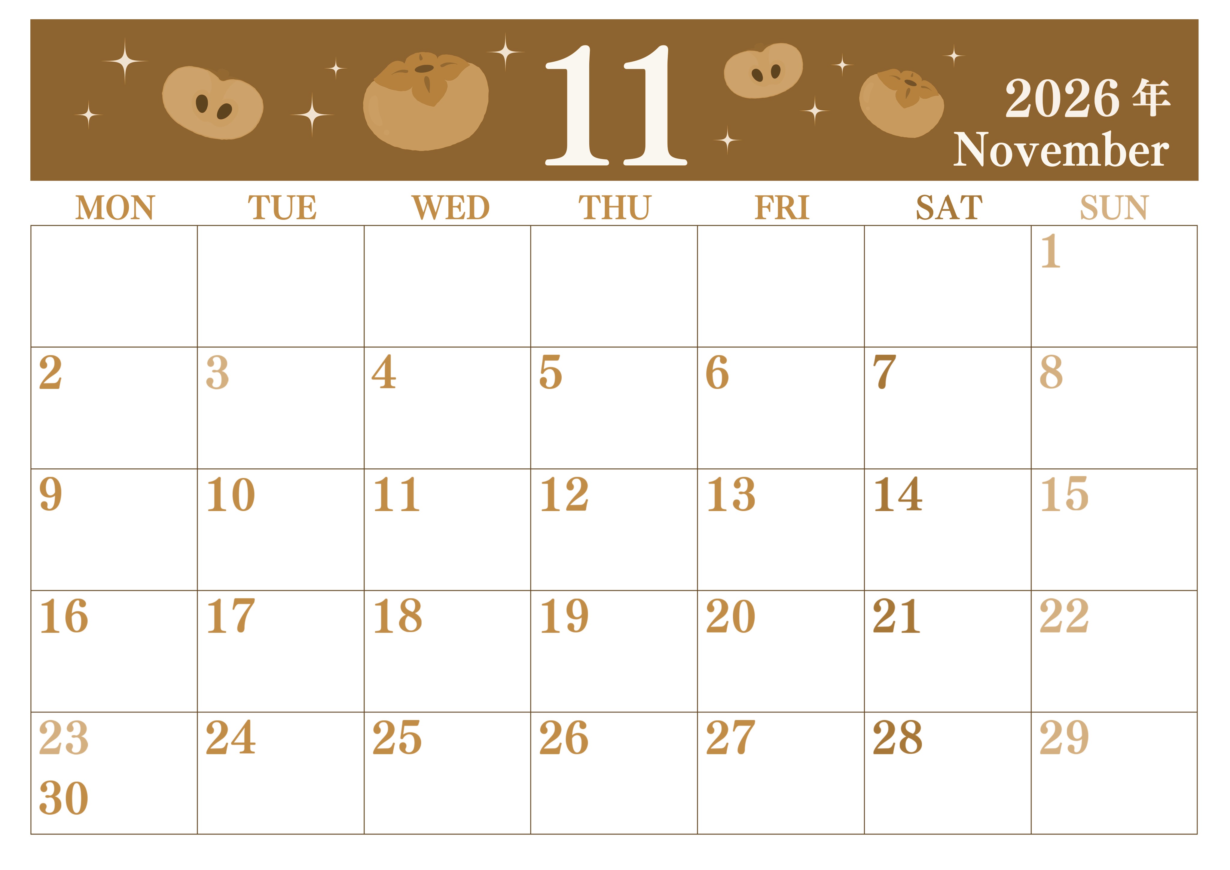 2026年11月横型レトロな月曜始まり 柿イラストのかわいいA4無料セピア調カレンダー(2026-00701101)