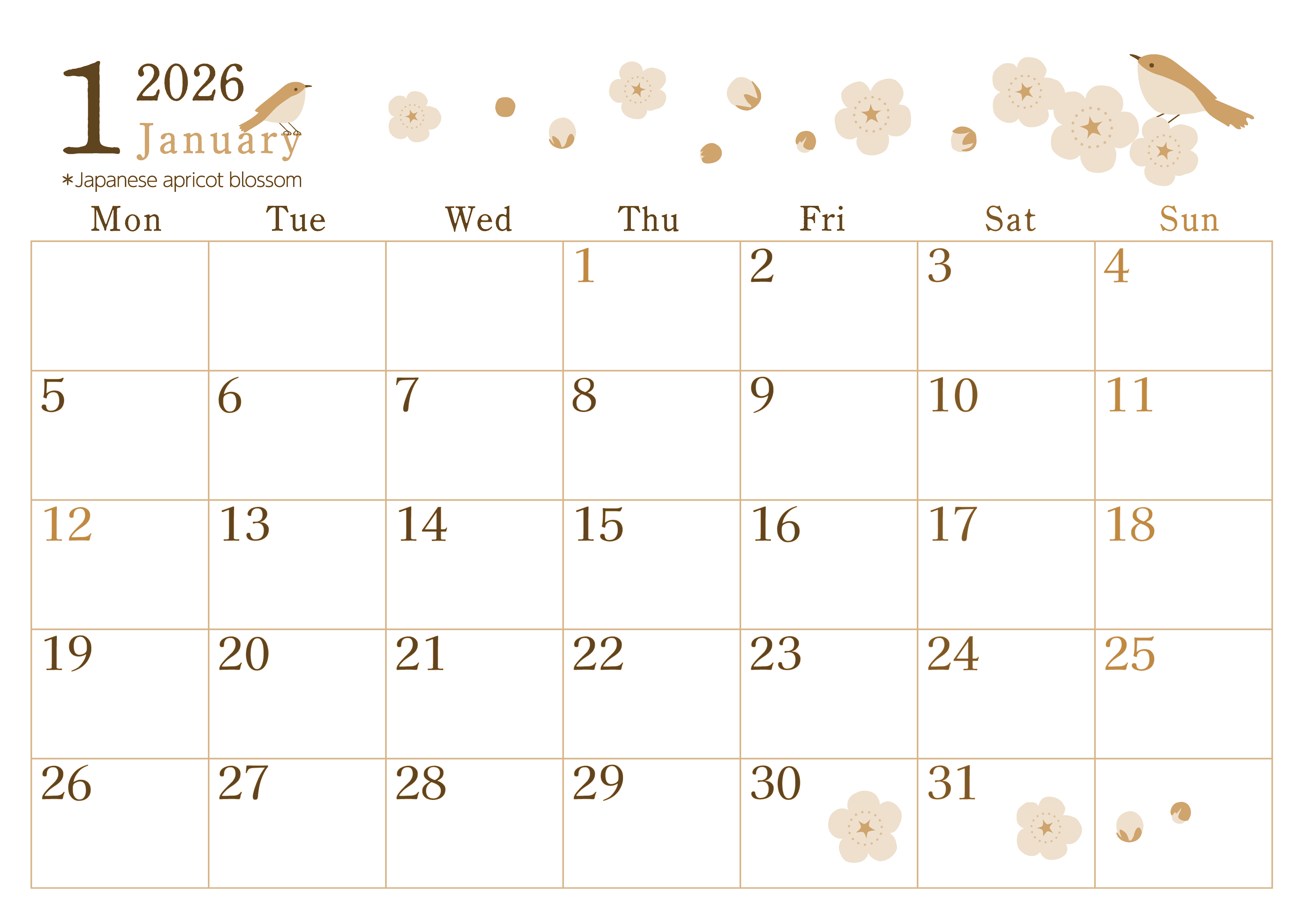 2026年1月横型レトロな月曜始まりセピア調カレンダーです。A4白紙への印刷用なのでプリンターのインクを使いすぎないようなシンプルデザインのセピア調カレンダーに仕上げました。シンプルでありながらうぐいすと花がかわいいイラストです。(2026-00710101)