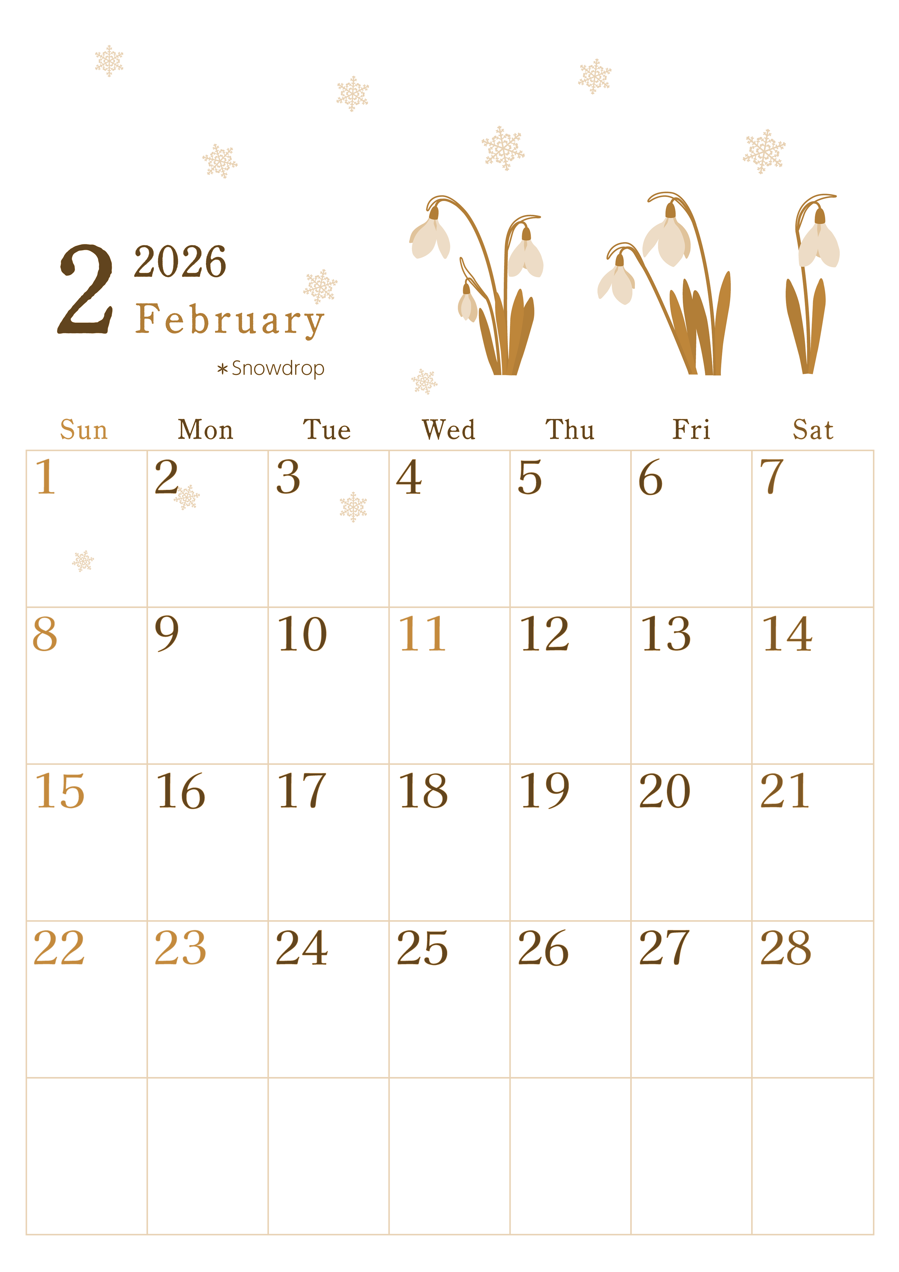 2026年2月縦型レトロな日曜始まりセピア調カレンダーです。スノードロップの草花が大人かわいいを演出しているおしゃれなセピア調カレンダー素材です。フリーでありながらもイラストがしっかり描かれているデザインとなっています。(2026-00710210)