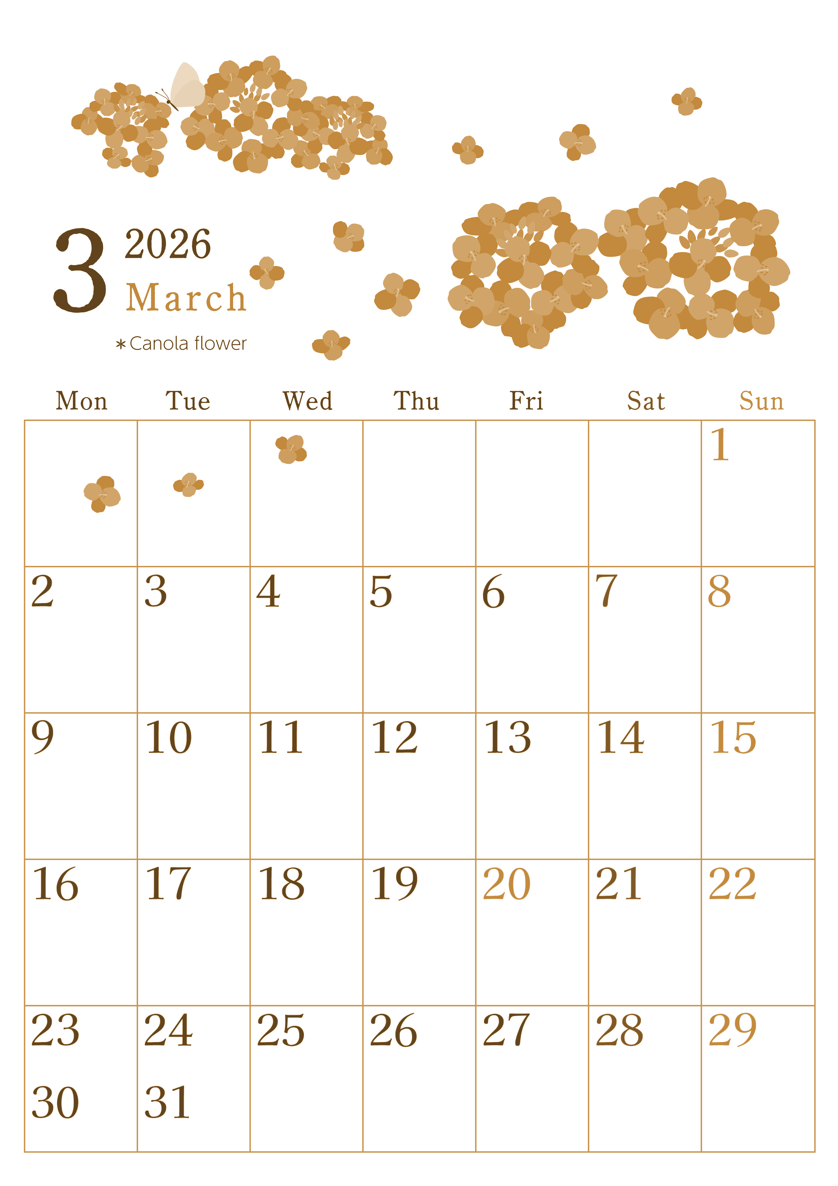 2026年3月縦型レトロな月曜始まりの無料テンプレートセピア調カレンダーです。白いモンシロチョウと菜の花の組み合わせがかわいいイラスト付きセピア調カレンダーです。白紙に印刷するだけですぐに月曜始まりのセピア調カレンダーが手に入るので便利です。(2026-00710311)