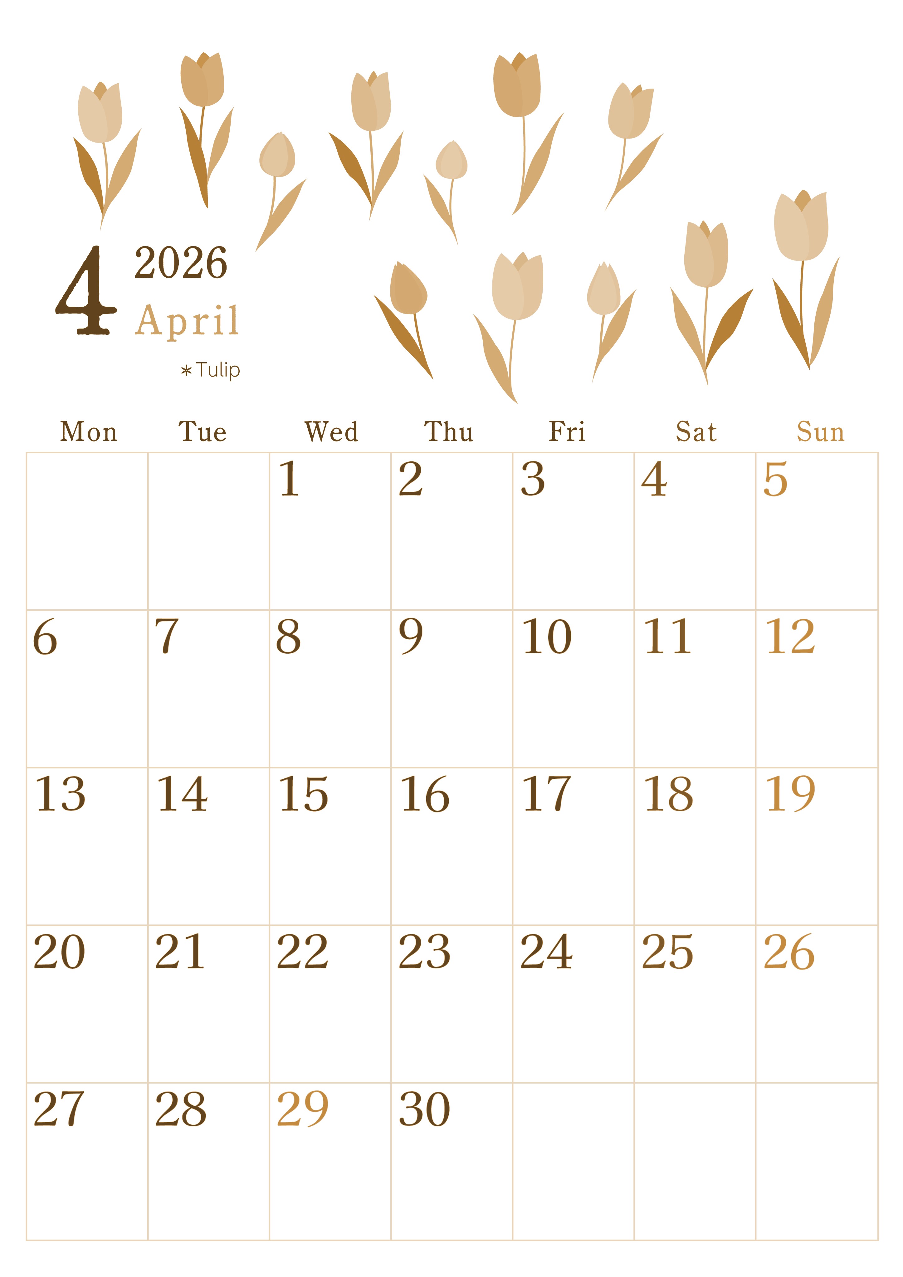 2026年4月縦型レトロな月曜始まりの無料テンプレートセピア調カレンダーです。美しいチューリップのイラストが素朴でありながらもかわいいイラストが推しポイントのセピア調カレンダーです。月曜始まりでタスク管理を抜かりなく行いたいという方におすすめです。(2026-00710411)