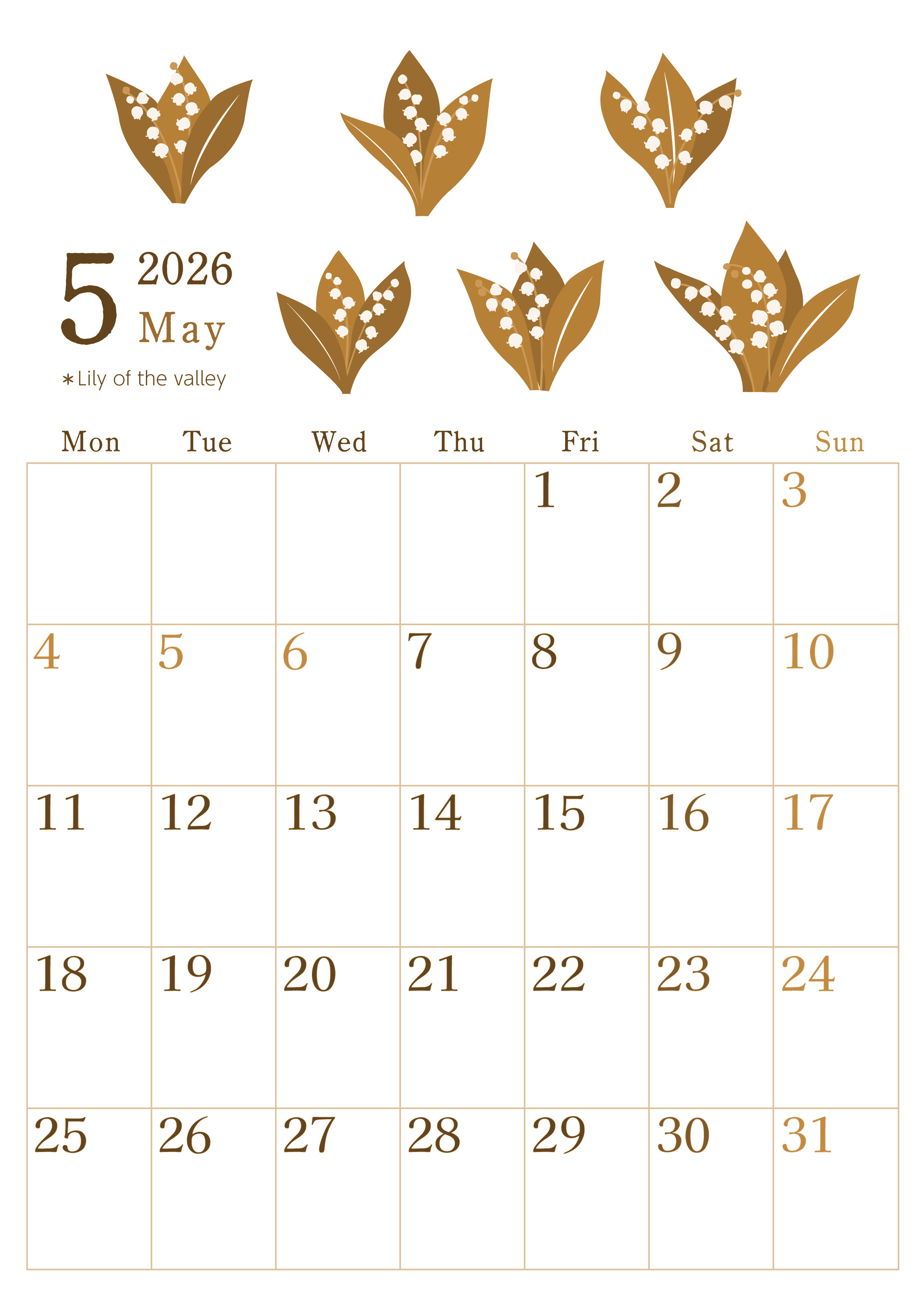 2026年5月縦型レトロな月曜始まりの無料テンプレートセピア調カレンダーです。月曜始まりセピア調カレンダーを使うのが好きだという人に無料ダウンロードをおすすめしたいフリー素材です。白い花のイラストはシンプルかつかわいいです。(2026-00710511)