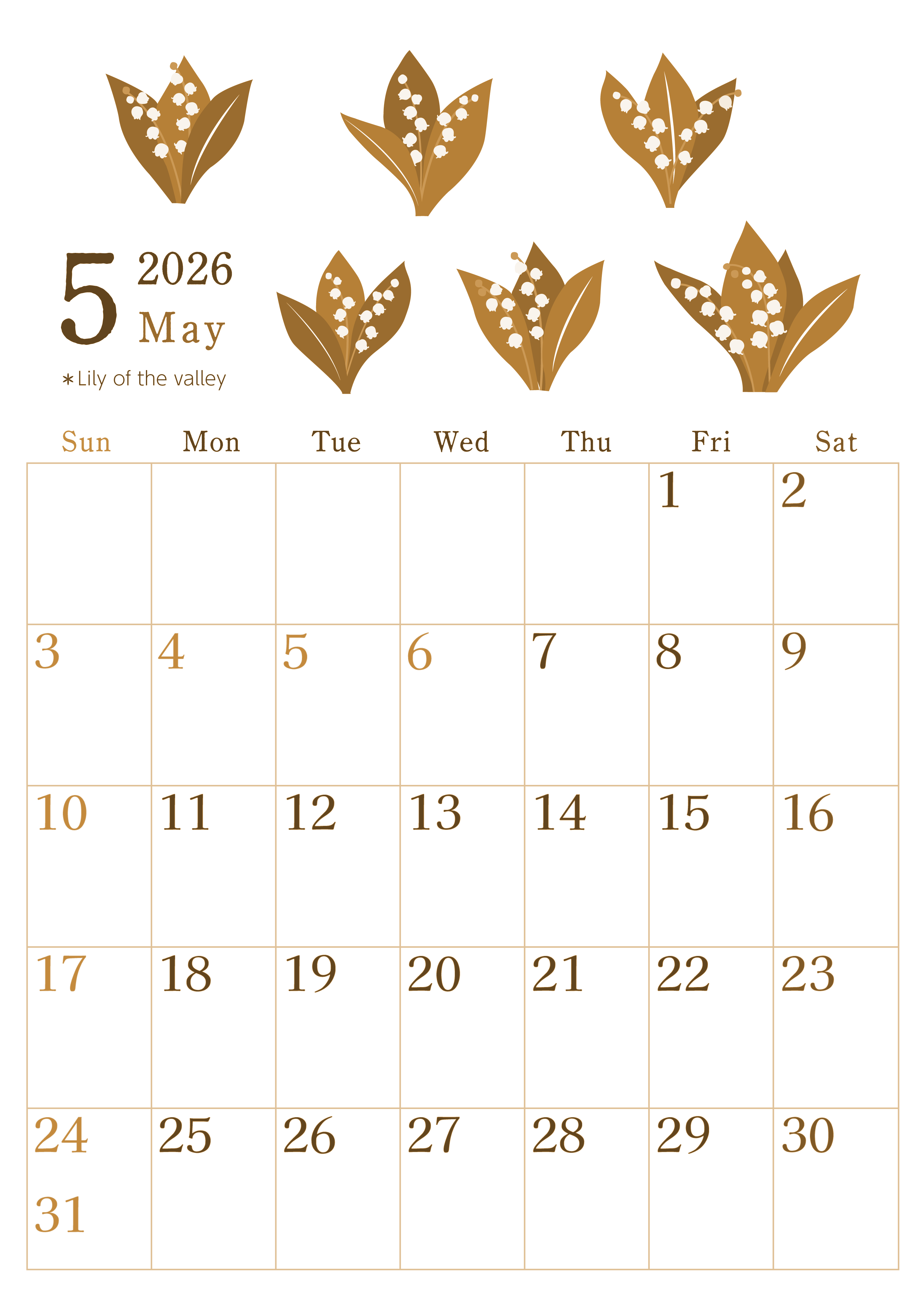 2026年5月縦型レトロな日曜始まりの無料テンプレートセピア調カレンダーです。白い花のイラストが素朴でかわいい季節感を感じるセピア調カレンダーです。罫線があるタイプなので実用性に溢れたレイアウトです。(2026-00710510)
