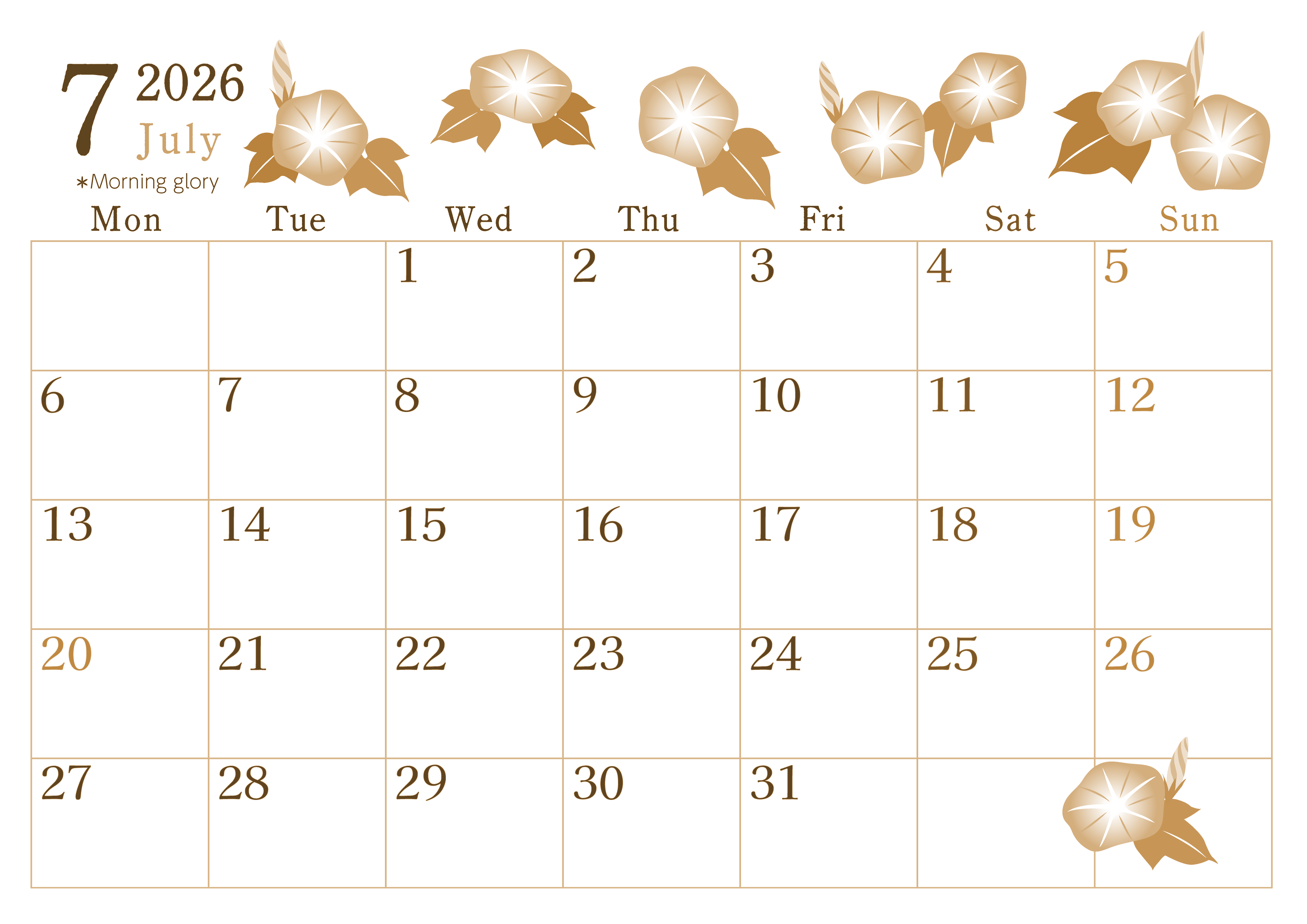 2026年7月横型レトロな月曜始まりの無料テンプレートセピア調カレンダーです。月曜始まりセピア調カレンダーの方が見やすいという人にうってつけの無料セピア調カレンダーです。シンプルでありながらも季節の花のイラストが上品に描かれていてかわいいです。(2026-00710701)