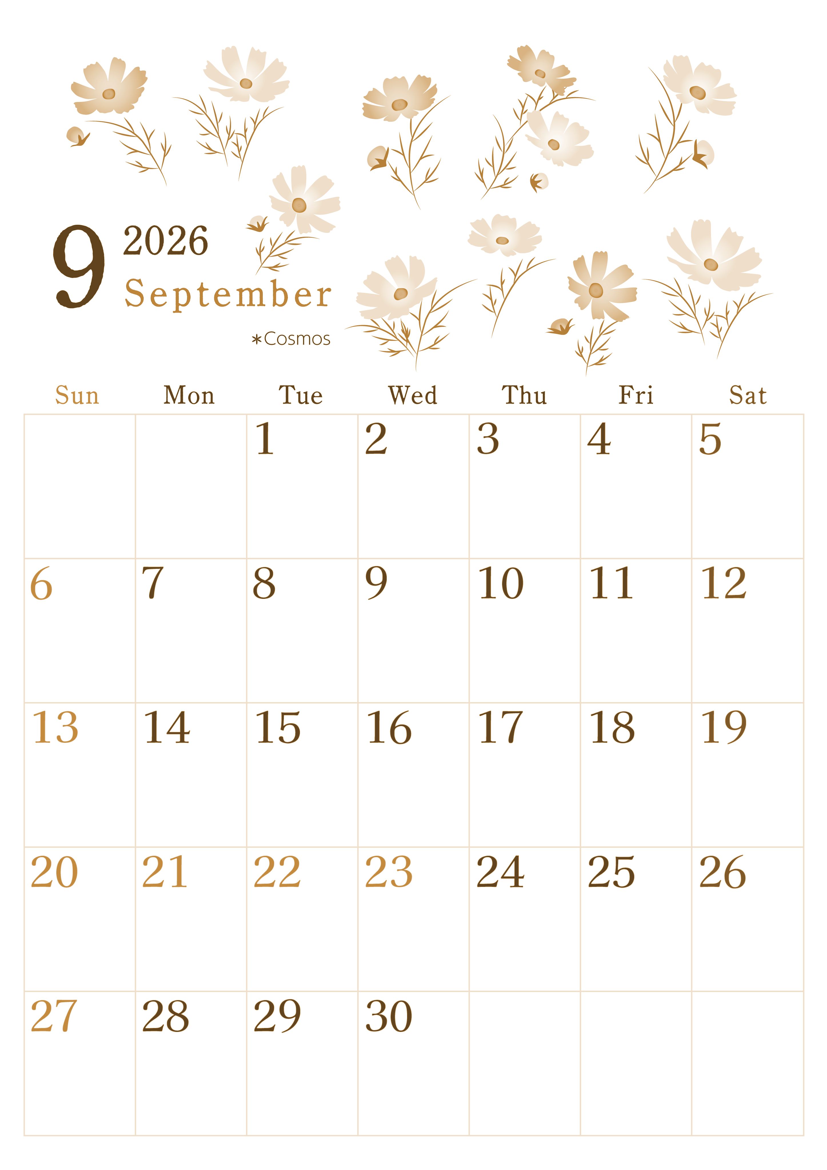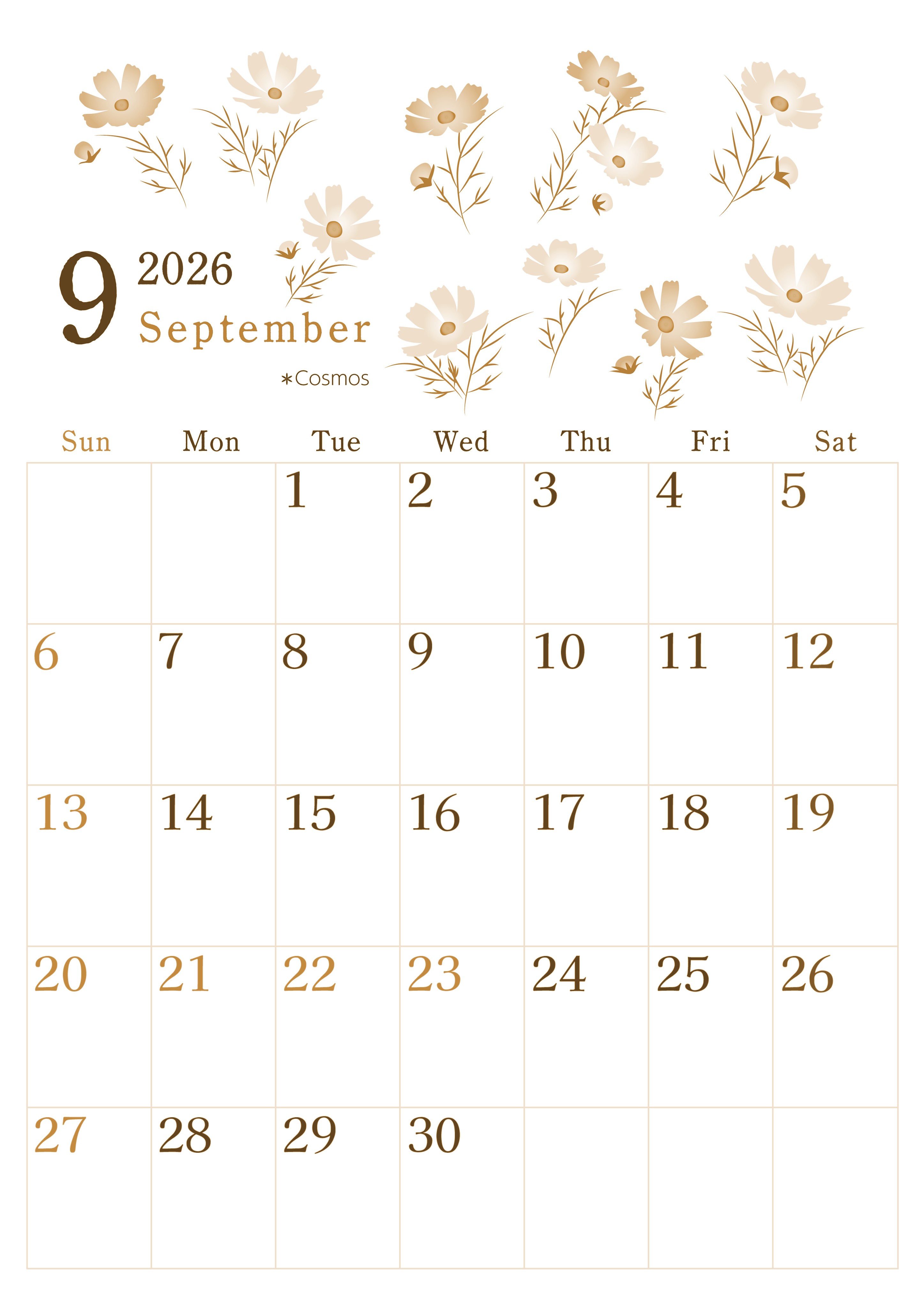 2026年・無料のカレンダーテンプレート 2026年9月縦型レトロな日曜始まり コスモスがかわいいイラストA4無料セピア調カレンダー(2026-00710910) 素材状デザイン王 2025年4月2日 2026年9月縦型レトロな日曜始まりの無料テンプレートセピア調カレンダーです。コスモスのイラストがかわいいです。素朴な雰囲気が全体的に広がっています。派手すぎないのでちょうどいいデザインです。(2026-00710910) 9月 縦型のカレンダー 日曜始まり セピア カレンダーデザイン-0071