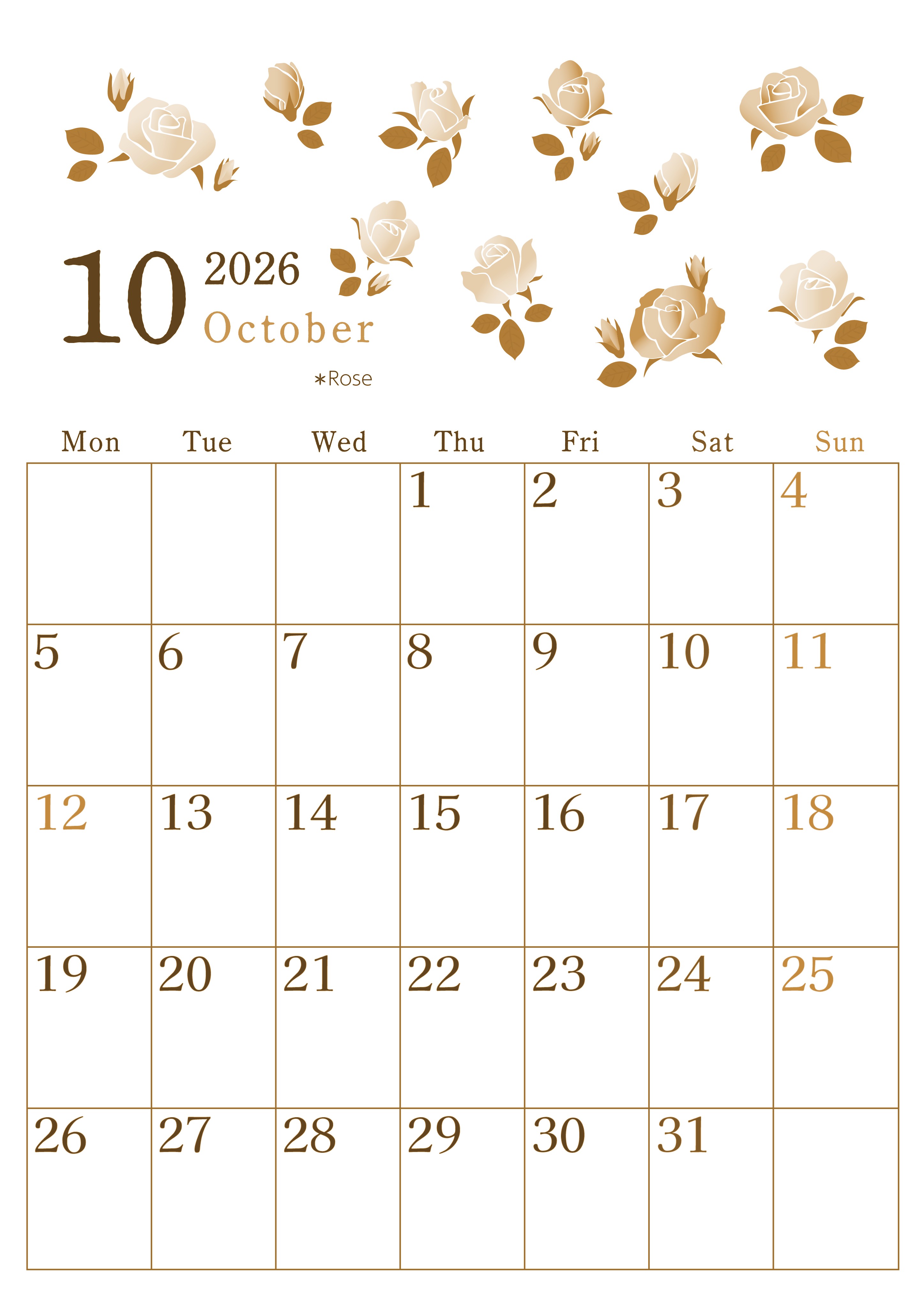 2026年10月縦型レトロな月曜始まりの無料テンプレートセピア調カレンダーです。月曜始まりタイプが好きな人におすすめです。イラスト部分に咲いているローズも大人かわいいです。曜日によって文字の色分けがされているので見やすいです。(2026-00711011)