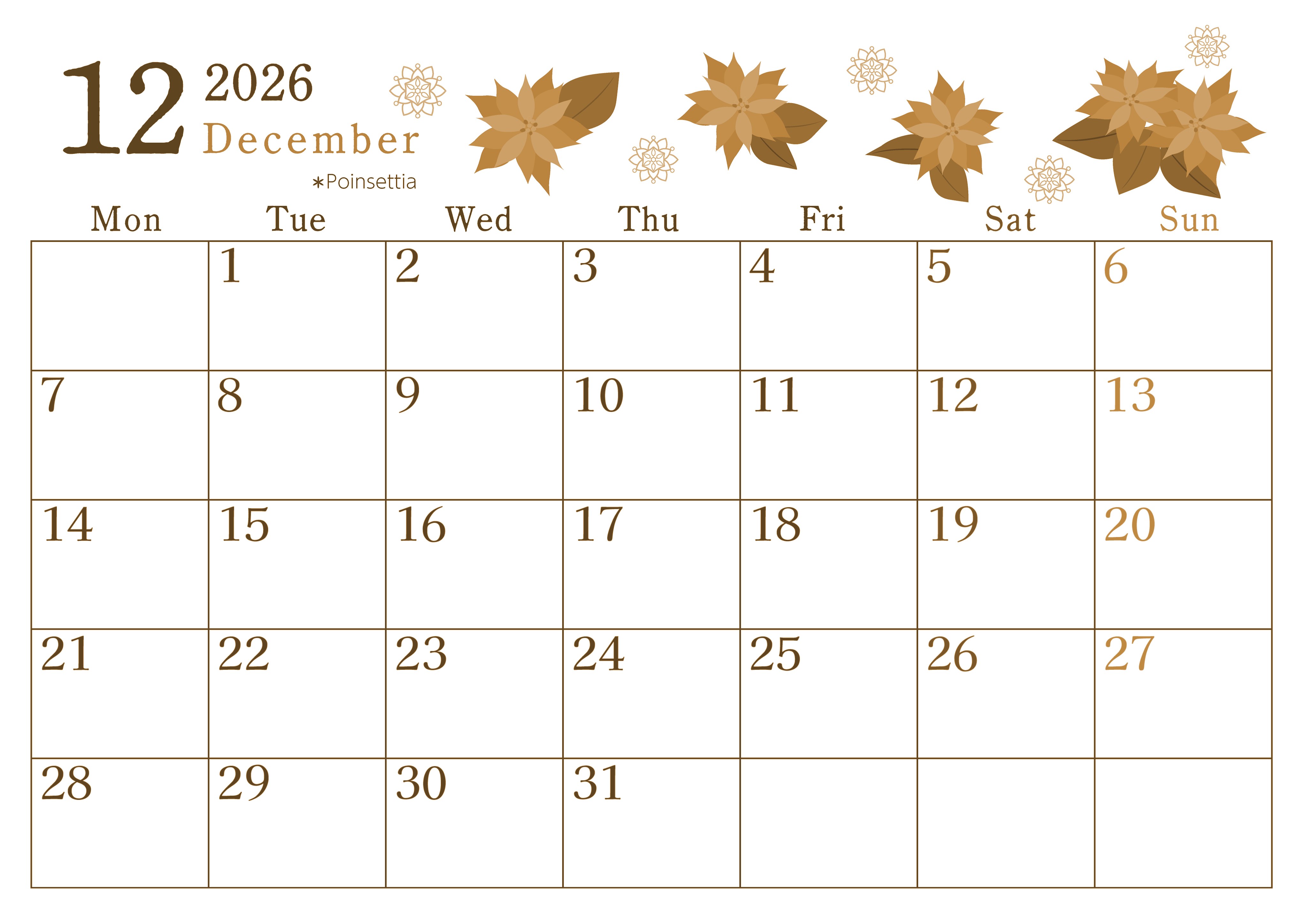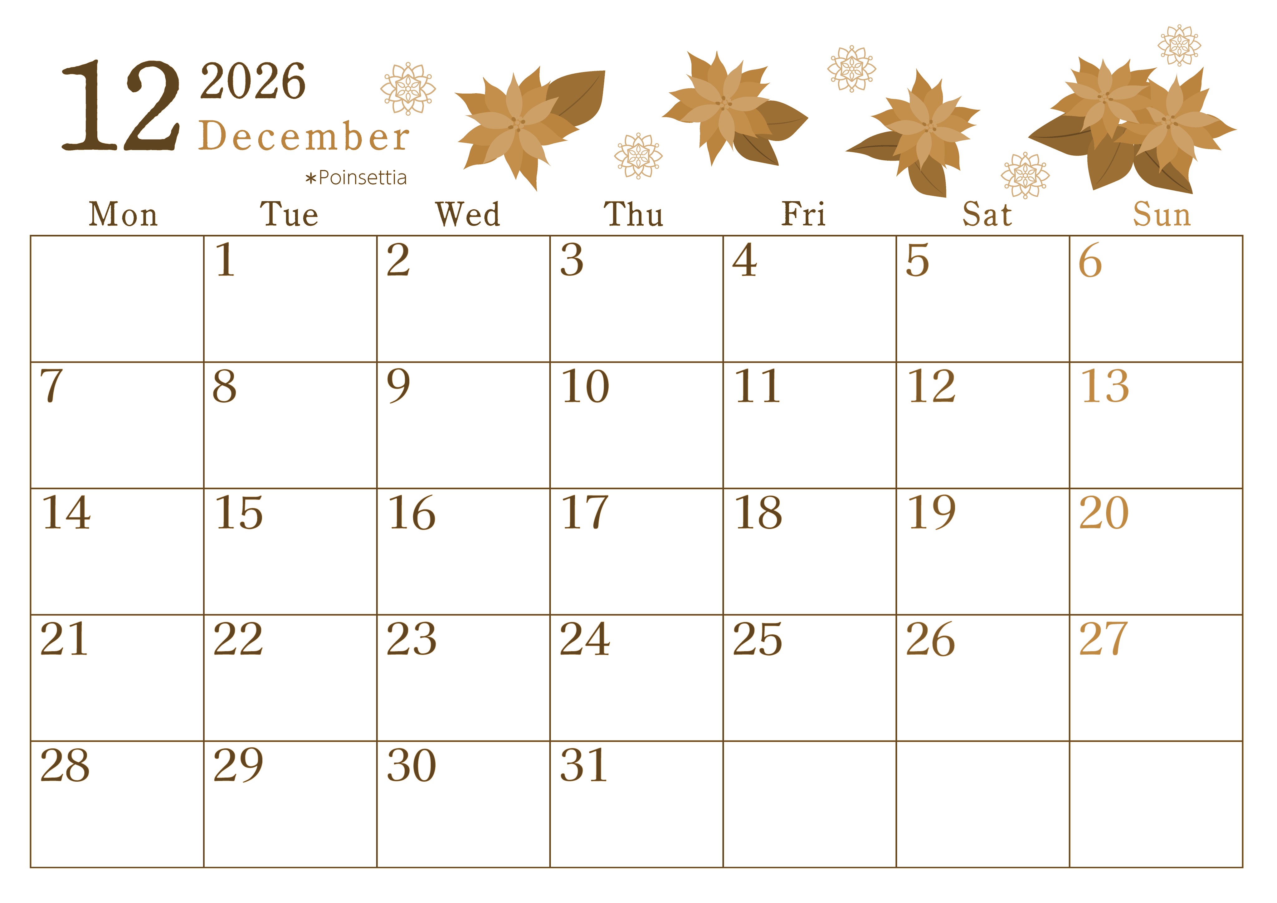 2026年12月横型レトロな月曜始まりの無料テンプレートセピア調カレンダーです。ポインセチアのイラストが大人かわいいです。インクをあまり使わないデザインなのでとてもエコですしシリーズで年間分を揃えて使うのに向いています。(2026-00711201)
