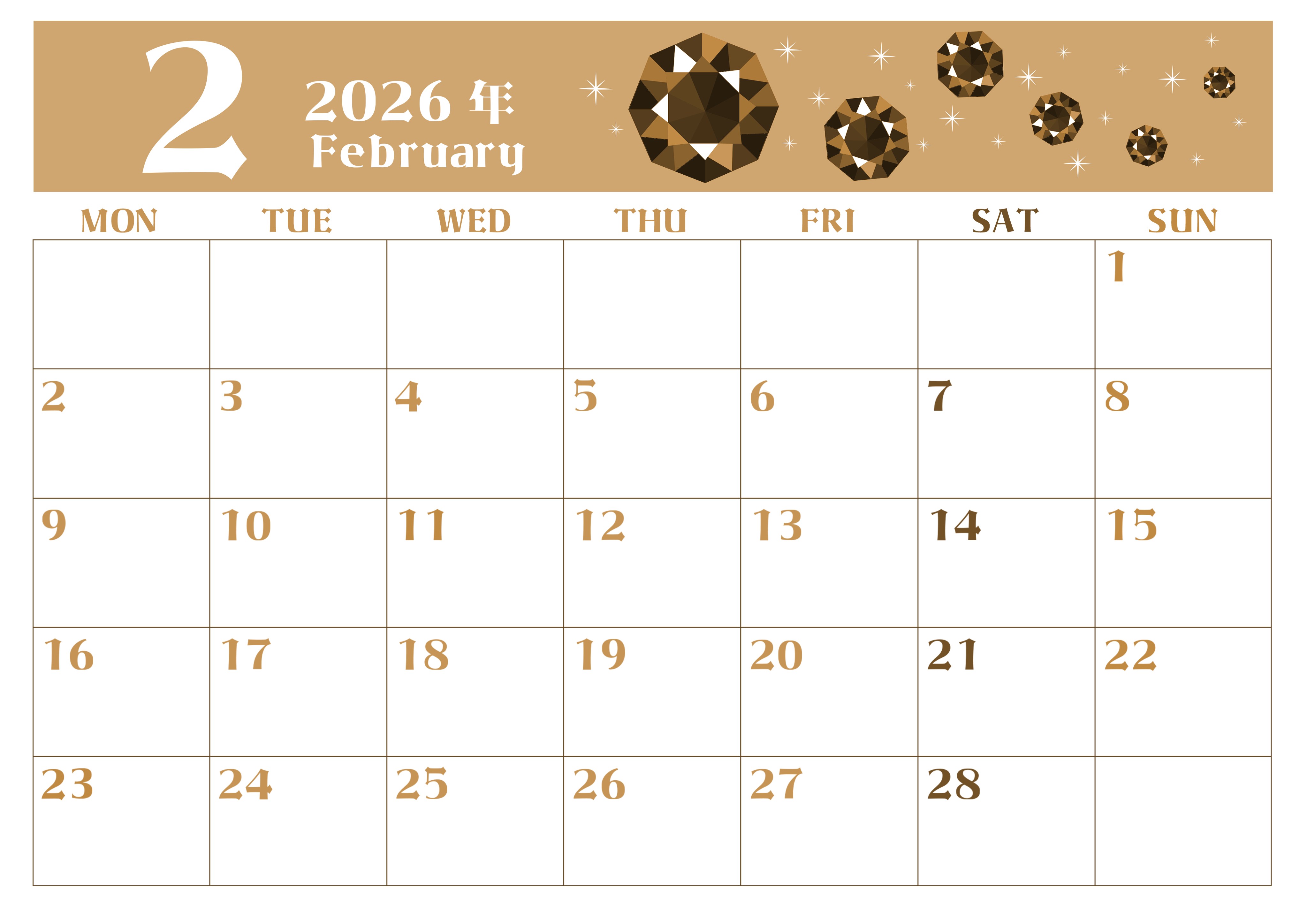 2026年2月横型レトロな月曜始まり 誕生石のイラストがおしゃれなA4無料セピア調カレンダー(2026-00720201)