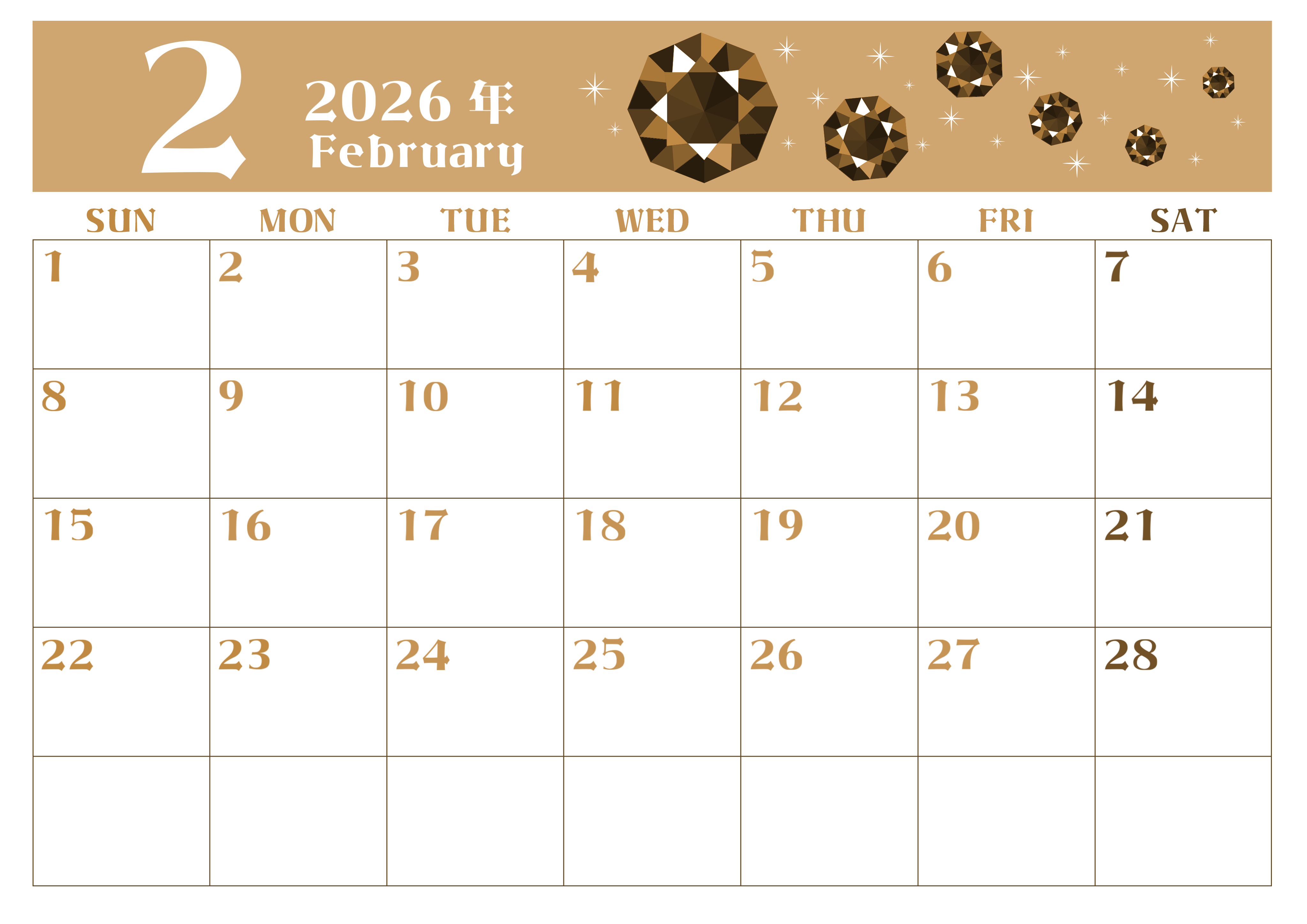 2026年2月横型レトロな日曜始まり 誕生石のイラストがおしゃれなA4無料セピア調カレンダー(2026-00720200)