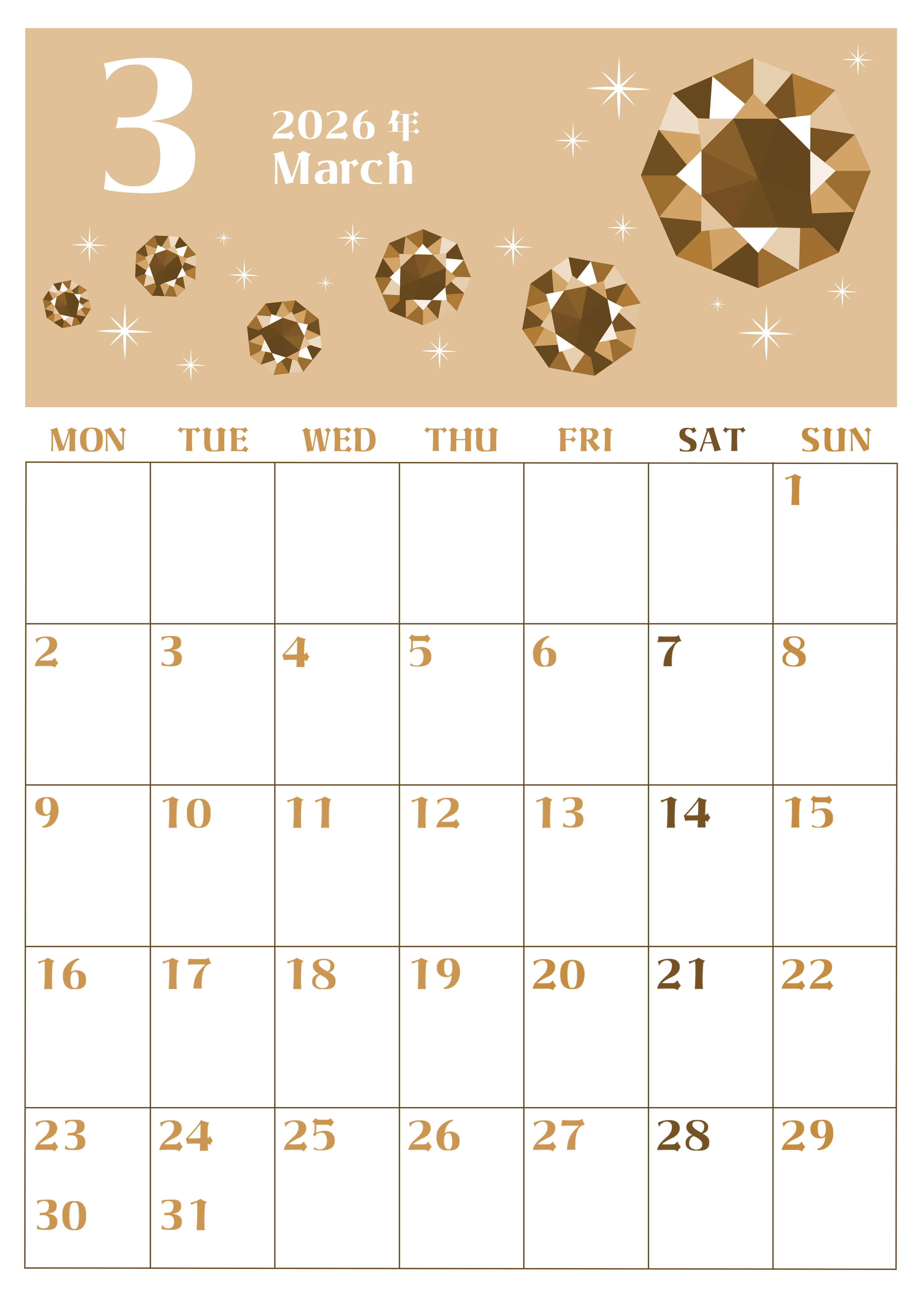 2026年3月縦型レトロな月曜始まりの無料テンプレートセピア調カレンダーです。月曜始まりでプラン立てがしやすいレイアウトのセピア調カレンダーです。3月の誕生石であるアクアマリンがイラストのメインテーマでおしゃれなデザインです。(2026-00720311)