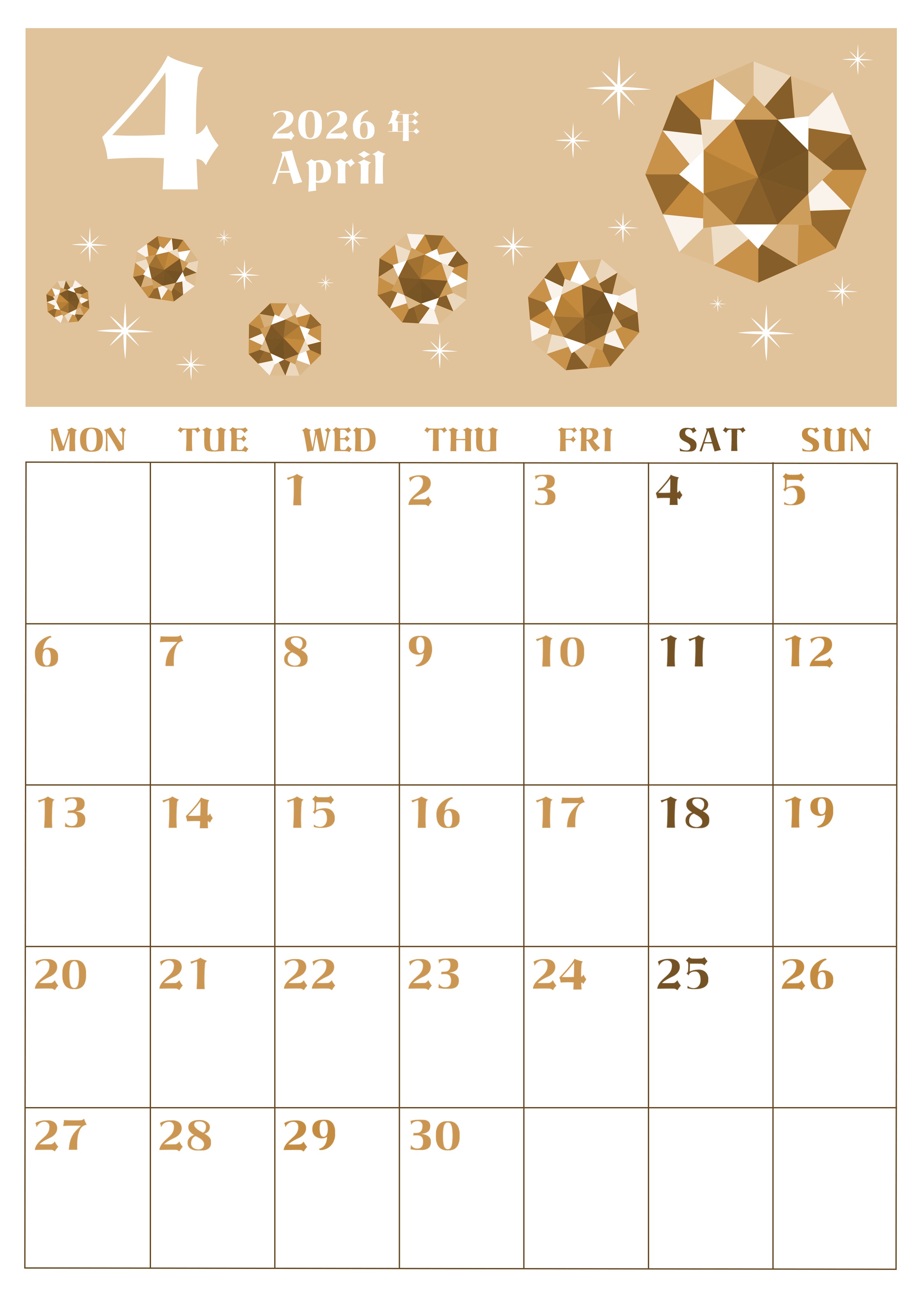 2026年4月縦型レトロな月曜始まりの無料テンプレートセピア調カレンダーです。キラキラと輝くダイヤモンドは4月の誕生石として有名です。誕生石をテーマデザインにしたイラストのセピア調カレンダーです。月曜始まりで勉強や仕事の計画を立てるのに貢献するフリー素材です。(2026-00720411)