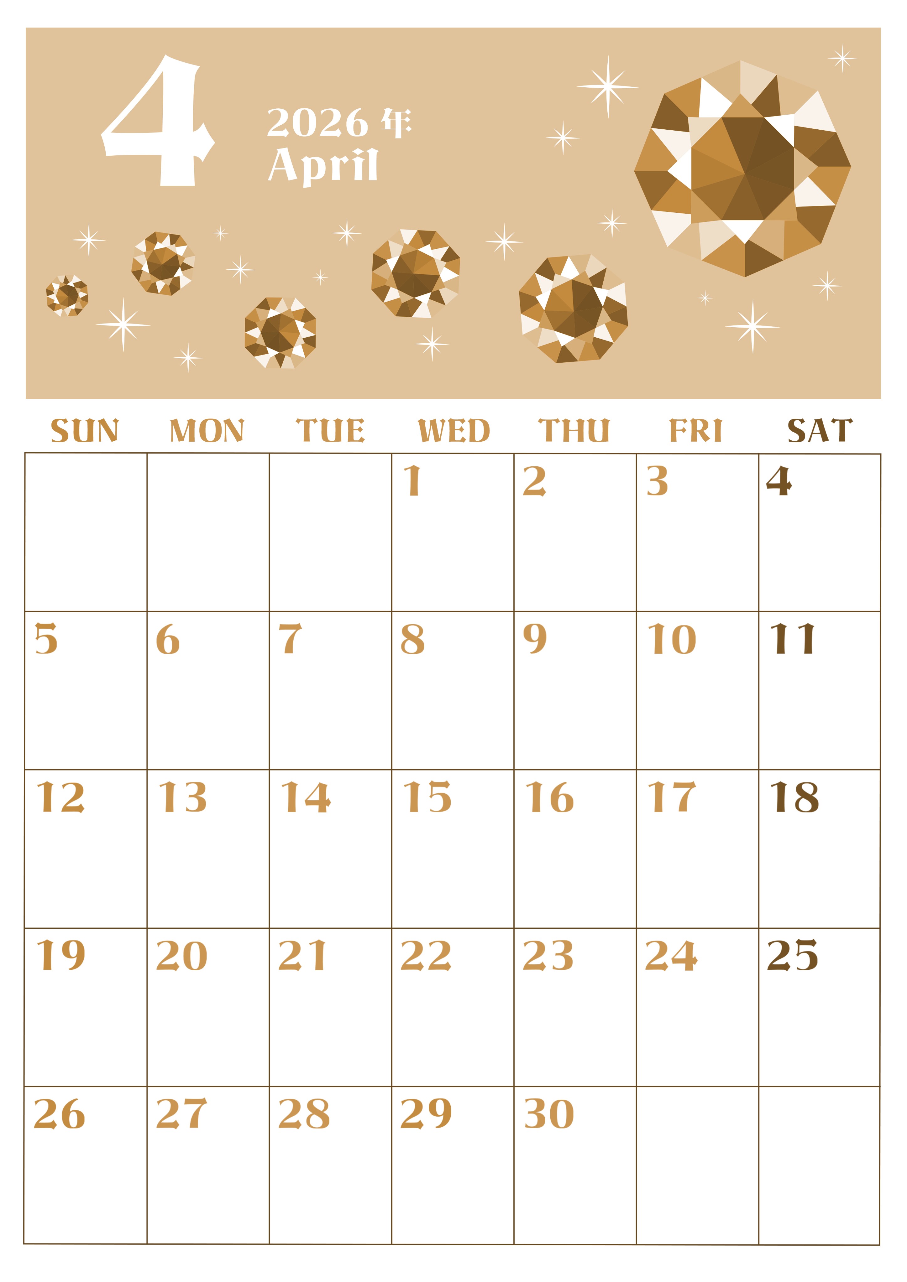 2026年4月縦型レトロな日曜始まりの無料テンプレートセピア調カレンダーです。おしゃれなイラストセピア調カレンダーです。4月に輝く誕生石のダイヤモンドがちりばめられたデザインで女心をくすぐられます。(2026-00720410)