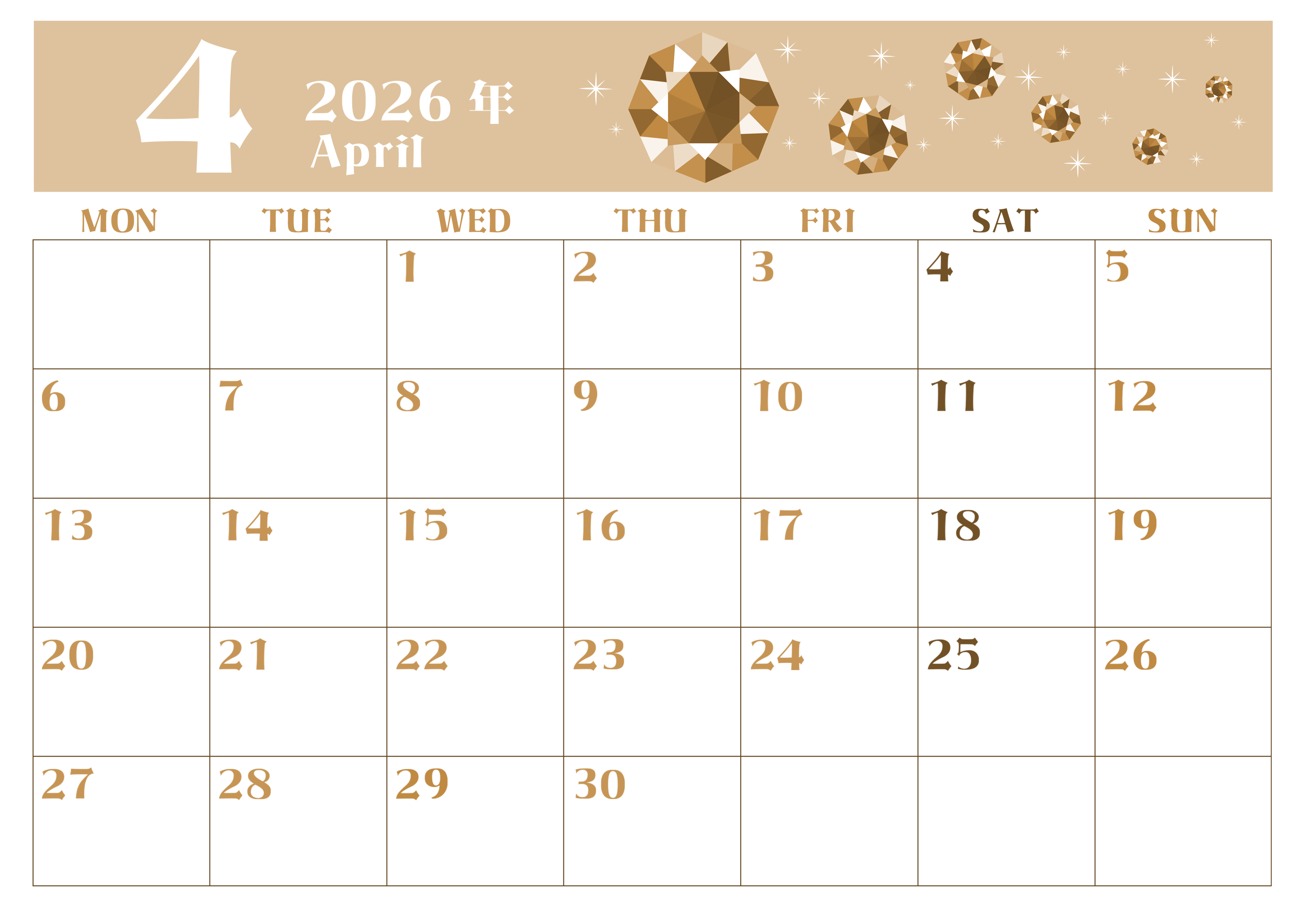 2026年4月横型レトロな月曜始まりの無料テンプレートセピア調カレンダーです。月曜始まりのセピア調カレンダーを使い慣れているという人にダウンロードしてほしい4月の誕生石であるダイヤモンドのイラストがおしゃれで大人っぽいフリー素材です。(2026-00720401)