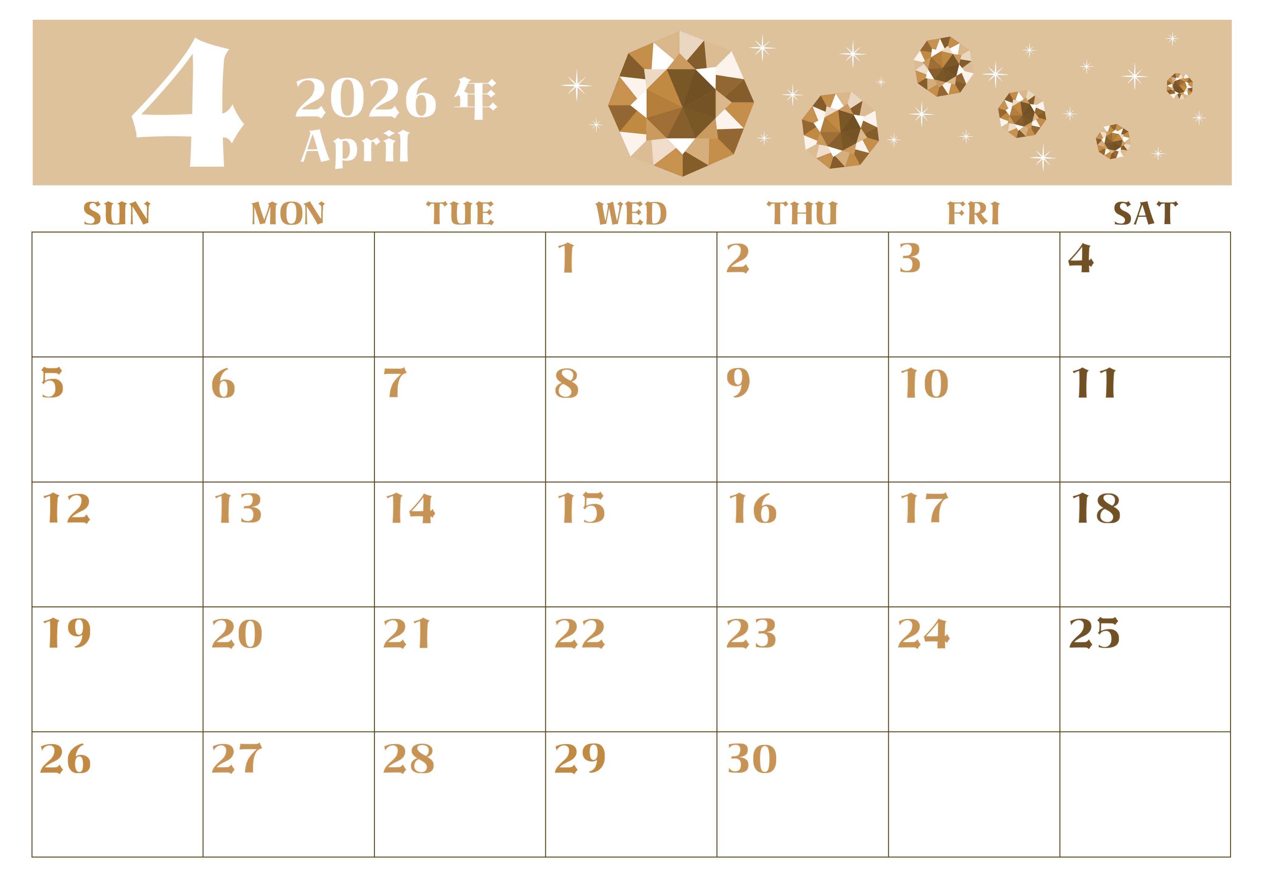 2026年4月横型レトロな日曜始まりの無料テンプレートセピア調カレンダーです。4月の誕生石であるダイヤモンドのイラストが美しくおしゃれな大人っぽいイラストがあしらわれたシックな無料セピア調カレンダーです。(2026-00720400)