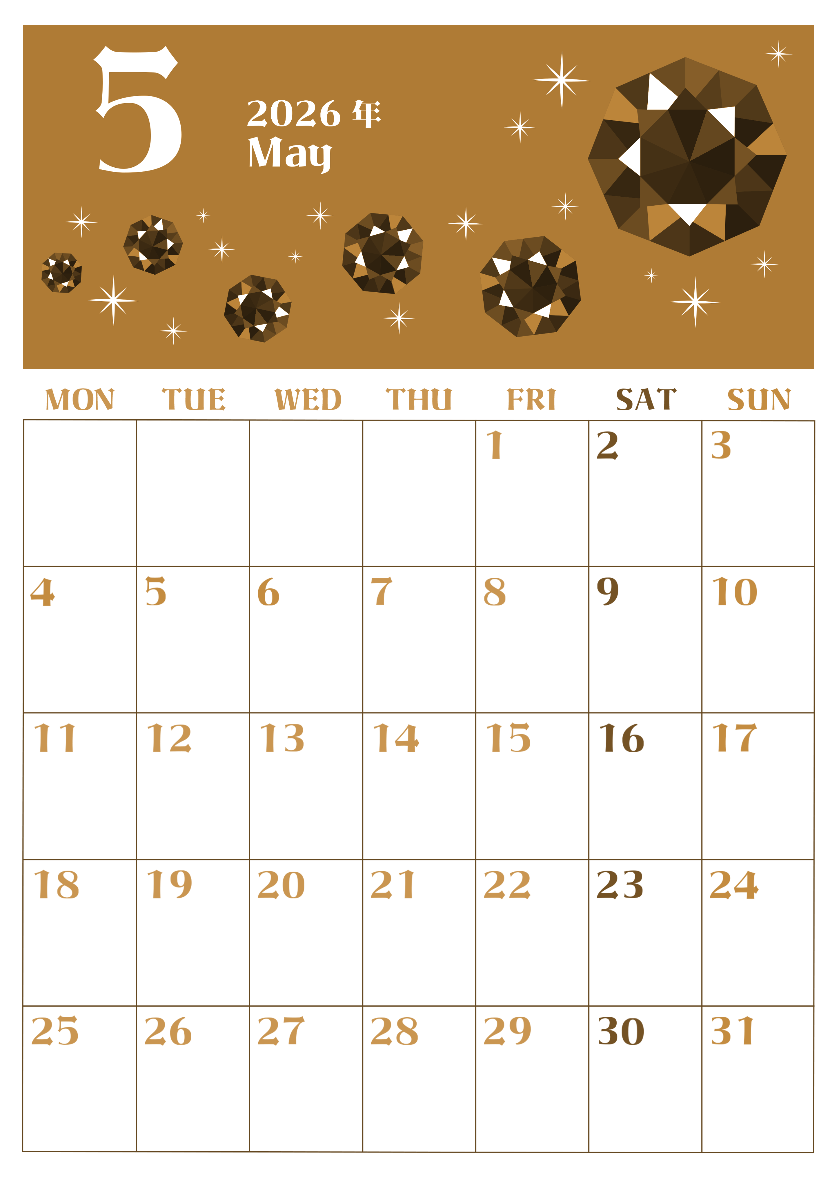 2026年5月縦型レトロな月曜始まりの無料テンプレートセピア調カレンダーです。月曜始まりで曜日の文字が色分けされているため、とても見やすいセピア調カレンダーです。5月の誕生石であるエメラルドのイラストがおしゃれでもあります。(2026-00720511)