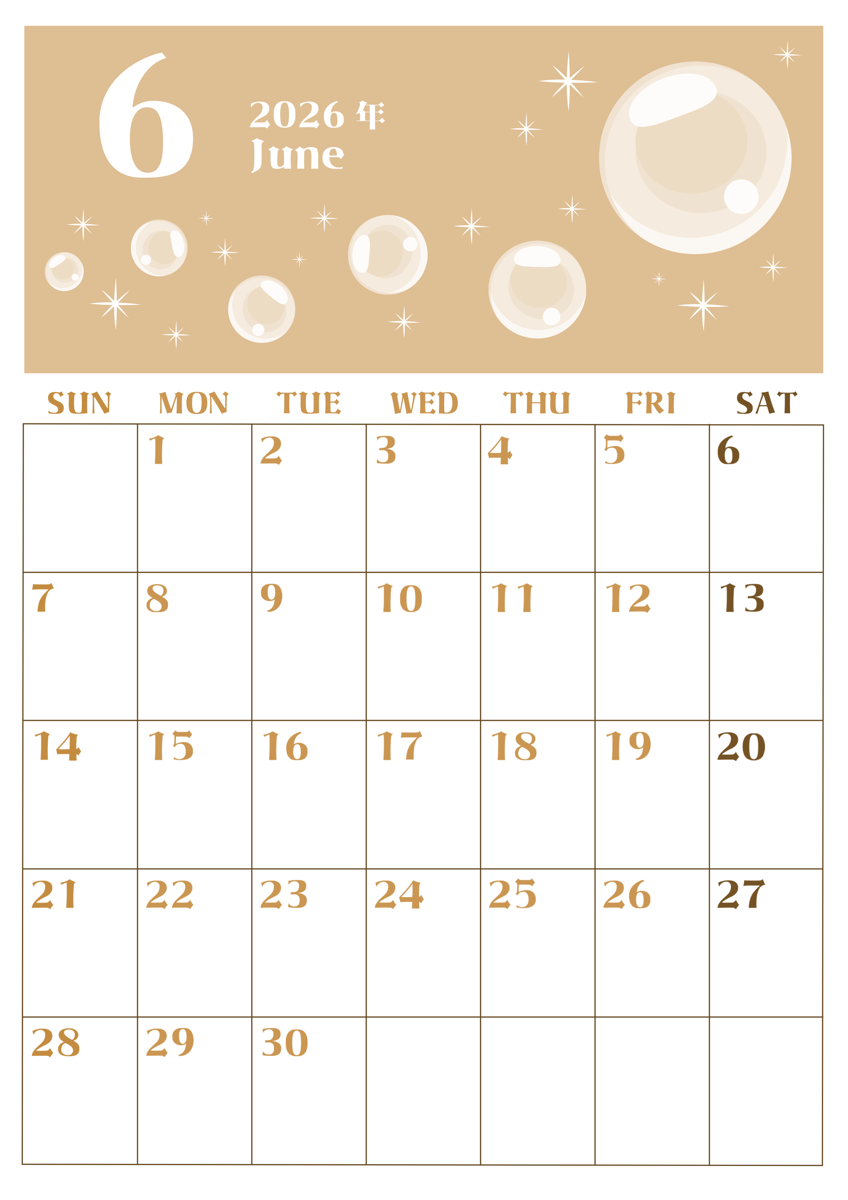 2026年6月縦型レトロな日曜始まりの無料テンプレートセピア調カレンダーです。おしゃれなセピア調カレンダーが使いたいという人にダウンロードをおすすめする6月の誕生石であるパールのイラストがつるんとしていておしゃれで美しいデザインです。(2026-00720610)