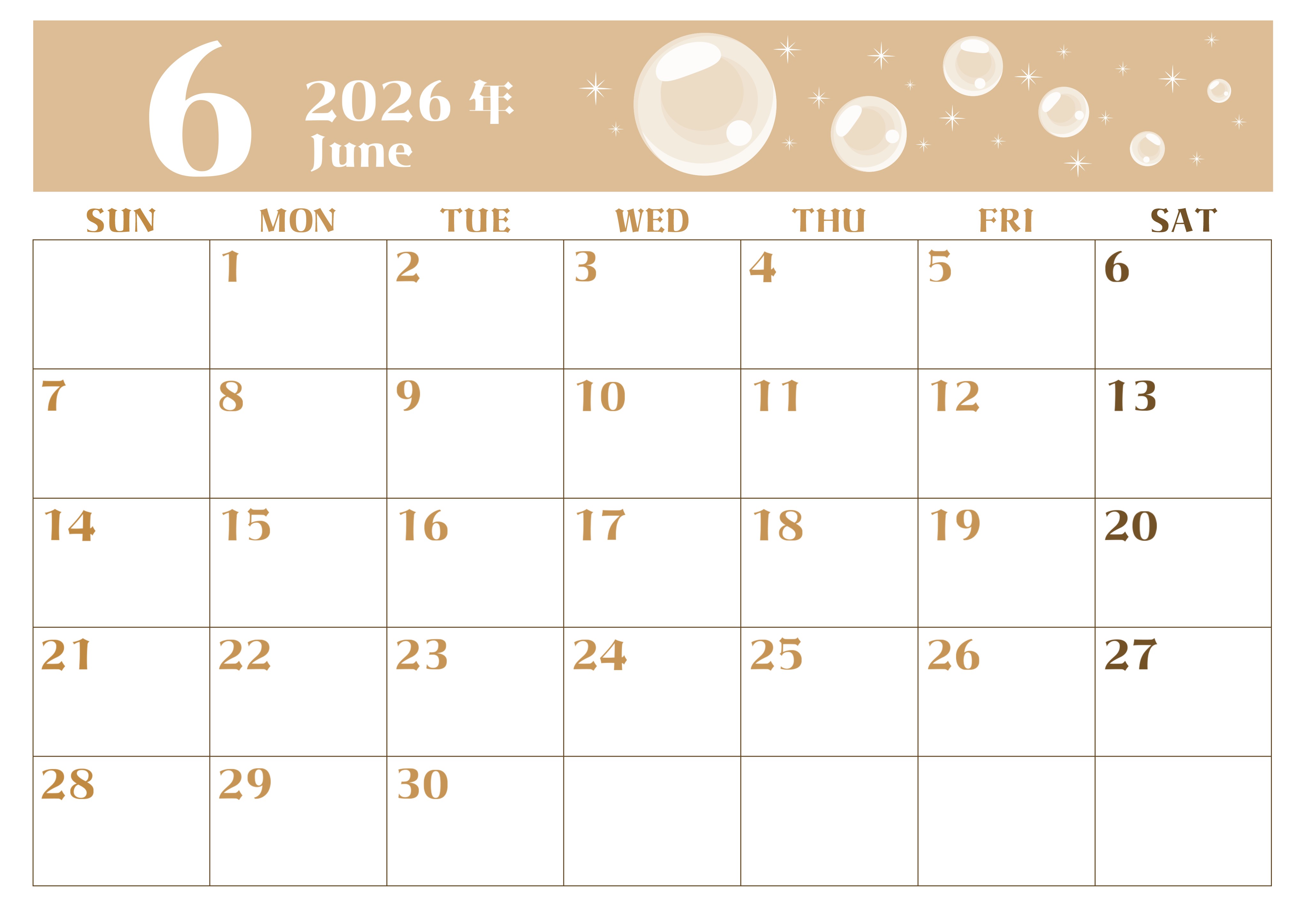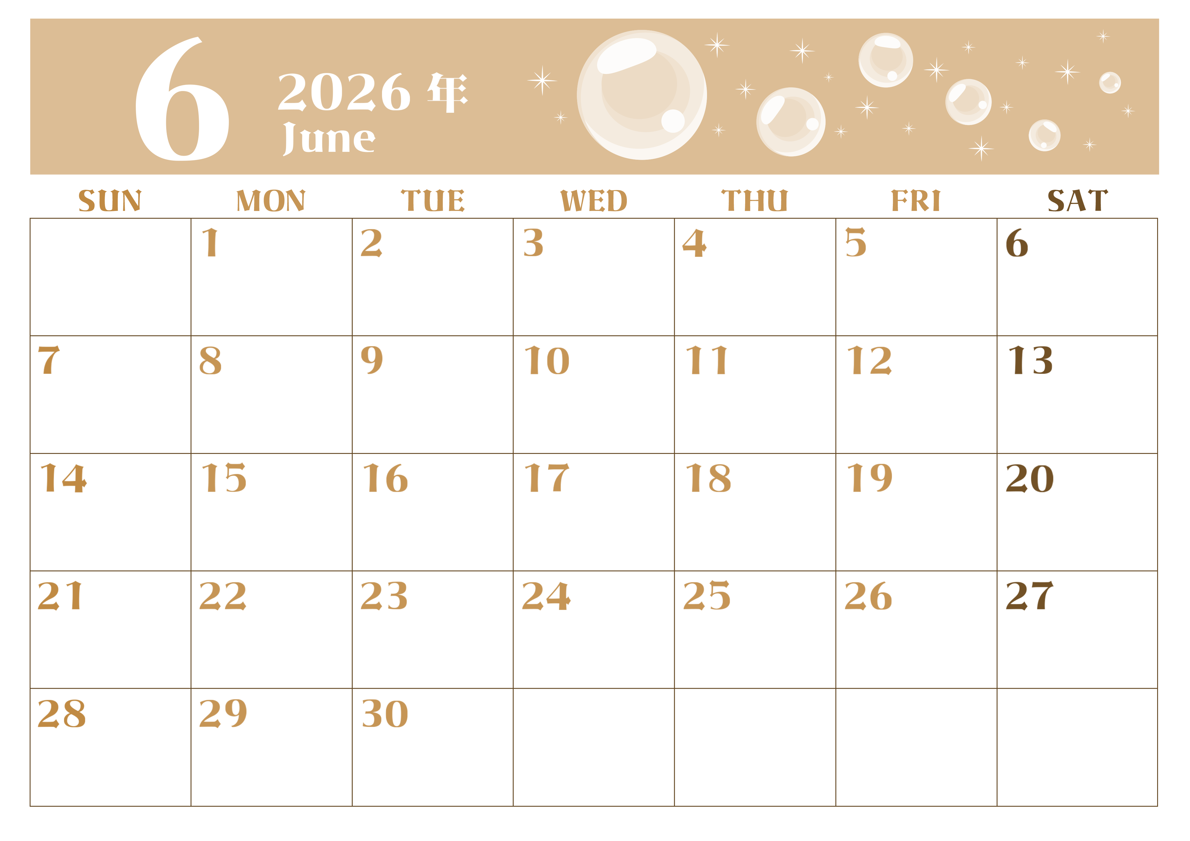 2026年・無料のカレンダーテンプレート 2026年6月横型レトロな日曜始まり 誕生石のイラストがおしゃれなA4無料セピア調カレンダー(2026-00720600) 素材状デザイン王 2025年4月2日 2026年6月横型レトロな日曜始まりの無料テンプレートセピア調カレンダーです。白くて丸い6月の誕生石であるパールがちりばめられているおしゃれで美しいイラストのセピア調カレンダーです。(2026-00720600) 6月 横型のカレンダー 日曜始まり セピア カレンダーデザイン-0072