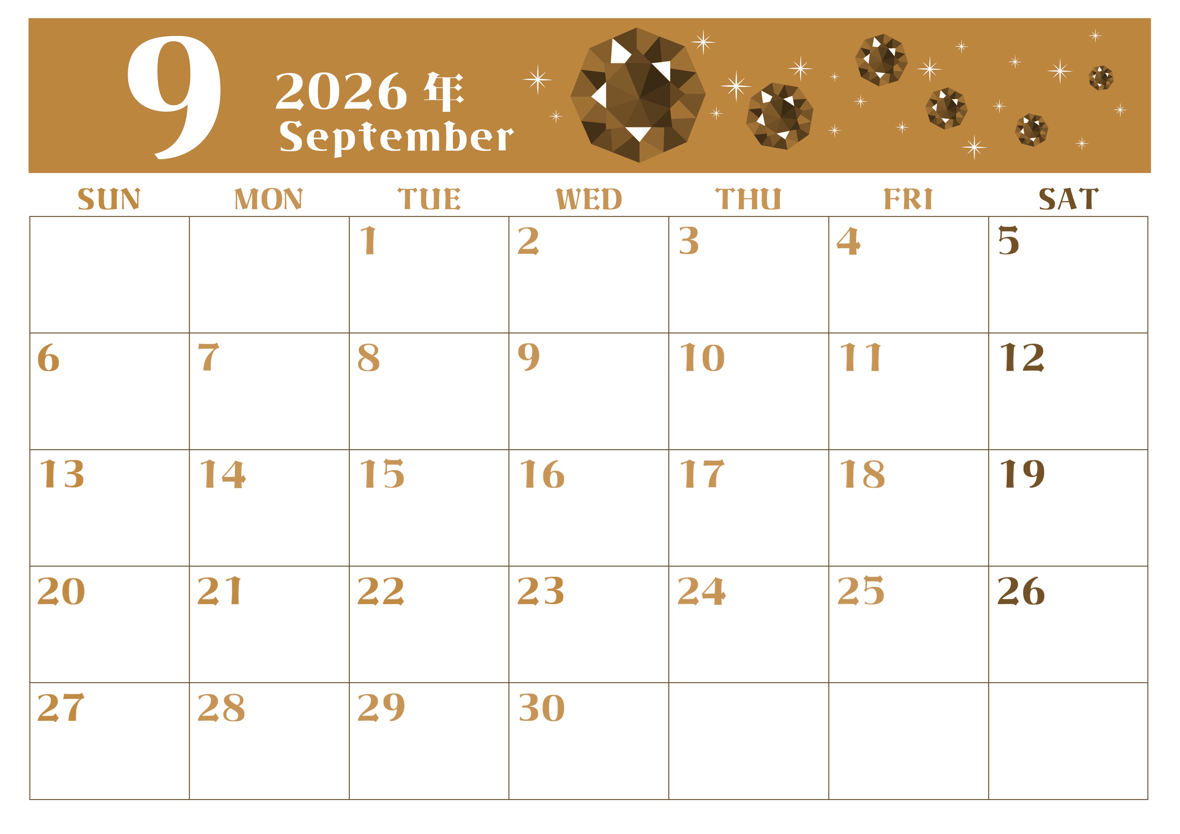 2026年・無料のカレンダーテンプレート 2026年9月横型レトロな日曜始まり 誕生石のイラストがおしゃれなA4無料セピア調カレンダー(2026-00720900) 素材状デザイン王 2025年4月2日 2026年9月横型レトロな日曜始まりの無料テンプレートセピア調カレンダーです。9月の誕生石であるサファイアのイラストがスタイリッシュかつおしゃれで気品のあるセピア調カレンダーです。(2026-00720900) 9月 横型のカレンダー 日曜始まり セピア カレンダーデザイン-0072