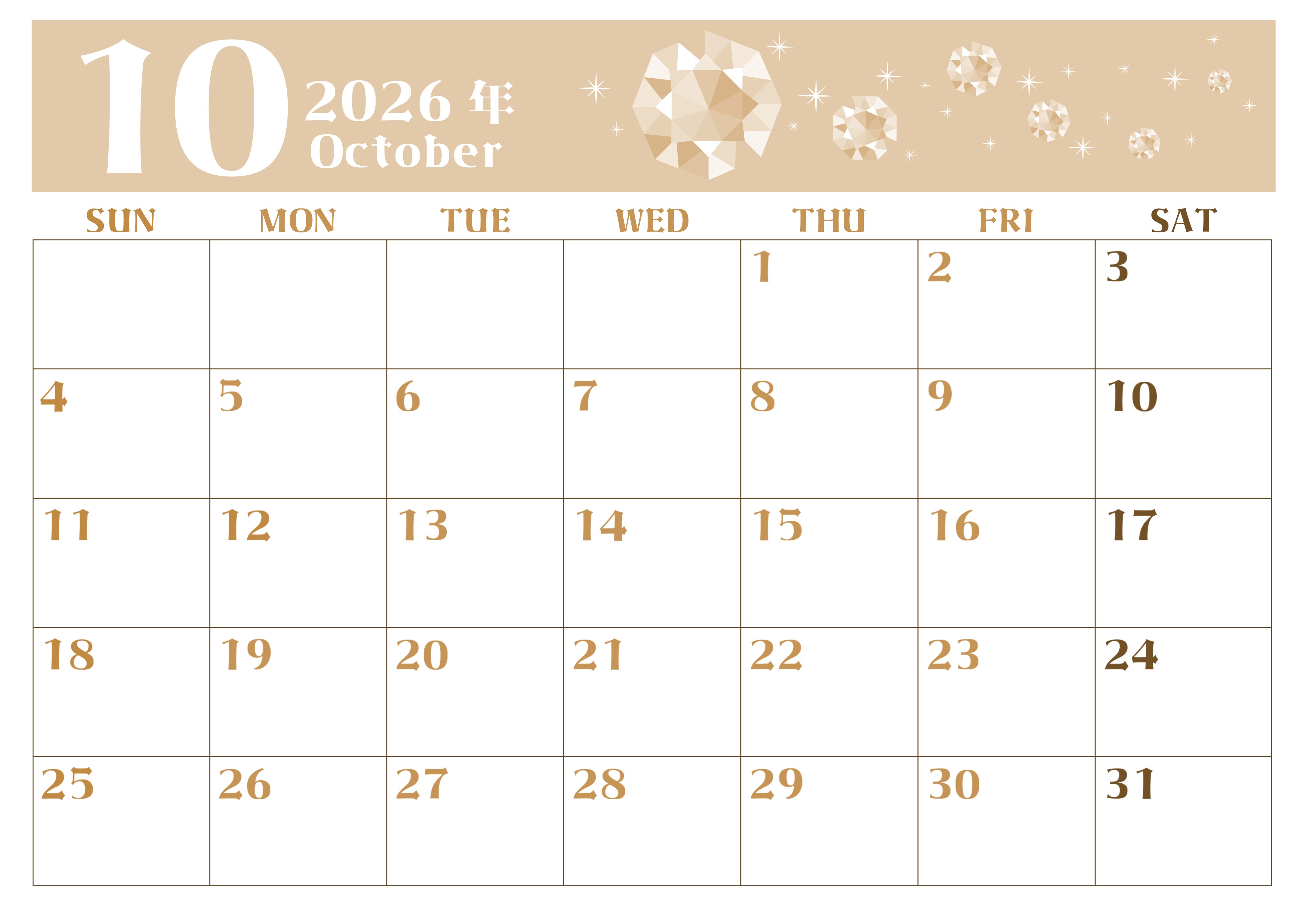2026年10月横型レトロな日曜始まりの無料テンプレートセピア調カレンダーです。10月の誕生石であるオパールのイラストがスタイリッシュかつおしゃれで気品のあるセピア調カレンダーです。目に優しいデザインです。(2026-00721000)