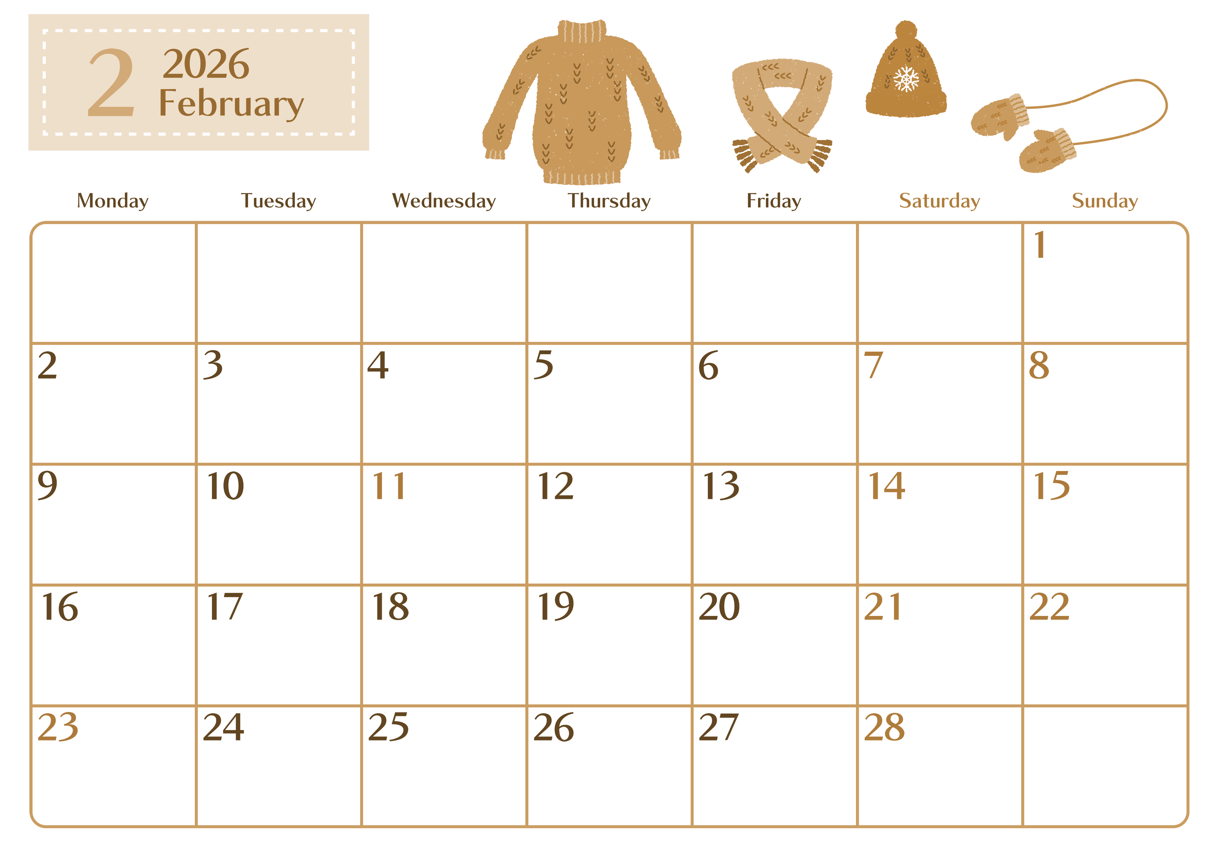 2026年2月横型レトロな月曜始まりの無料テンプレートセピア調カレンダーです。真冬の寒さを吹き飛ばしてくれるようなおしゃれで見やすいカレンダーとなっています。(2026-00730201)