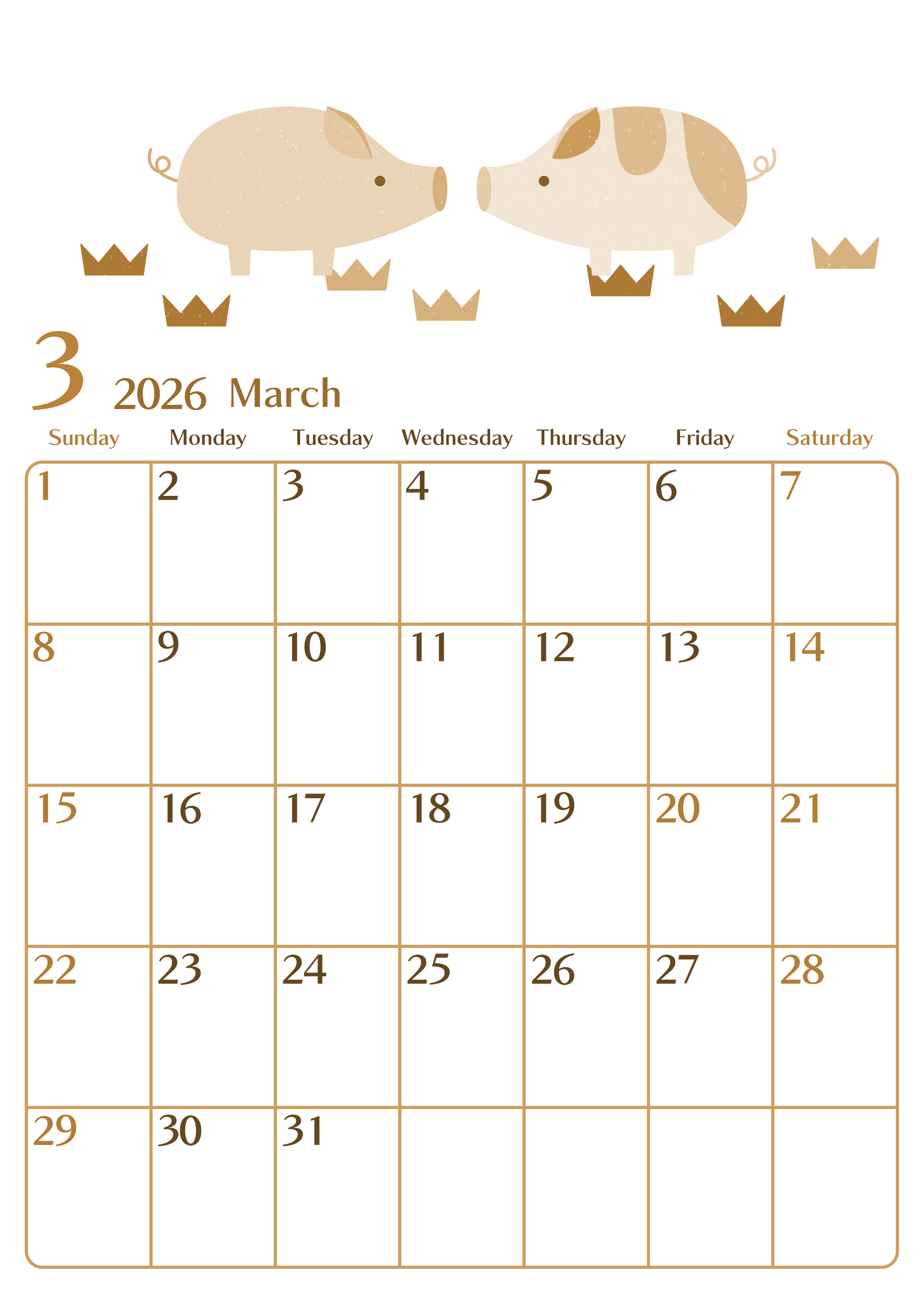 2026年3月縦型レトロな日曜始まり 子豚イラストのおしゃれA4無料セピア調カレンダー(2026-00730310)