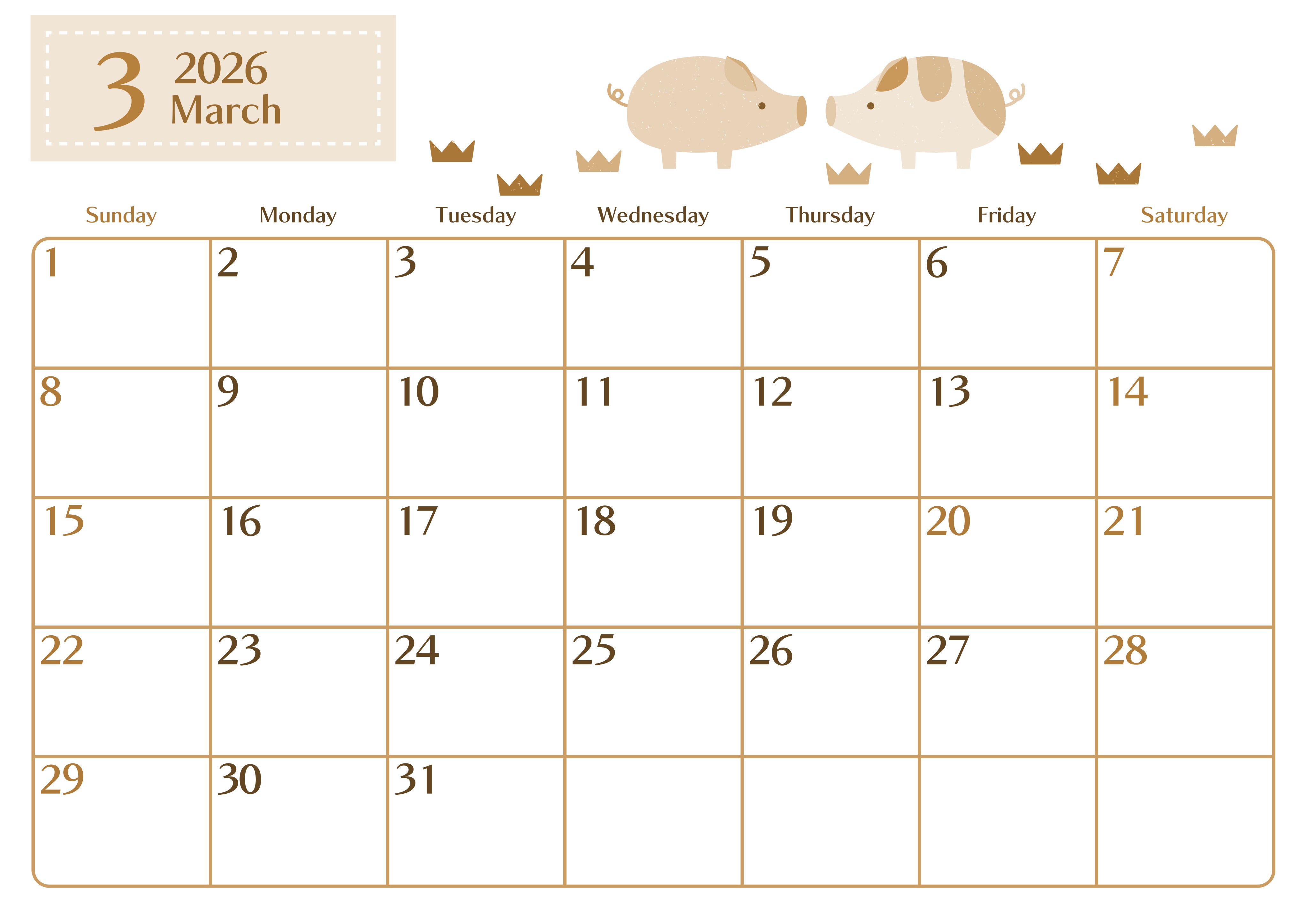2026年3月横型レトロな日曜始まりの無料テンプレートセピア調カレンダーです。子豚のカップルが仲良くしているおしゃれなアニマルテイストのセピア調カレンダーです。曜日によって文字の色分けがされているので役に立ちます。(2026-00730300)