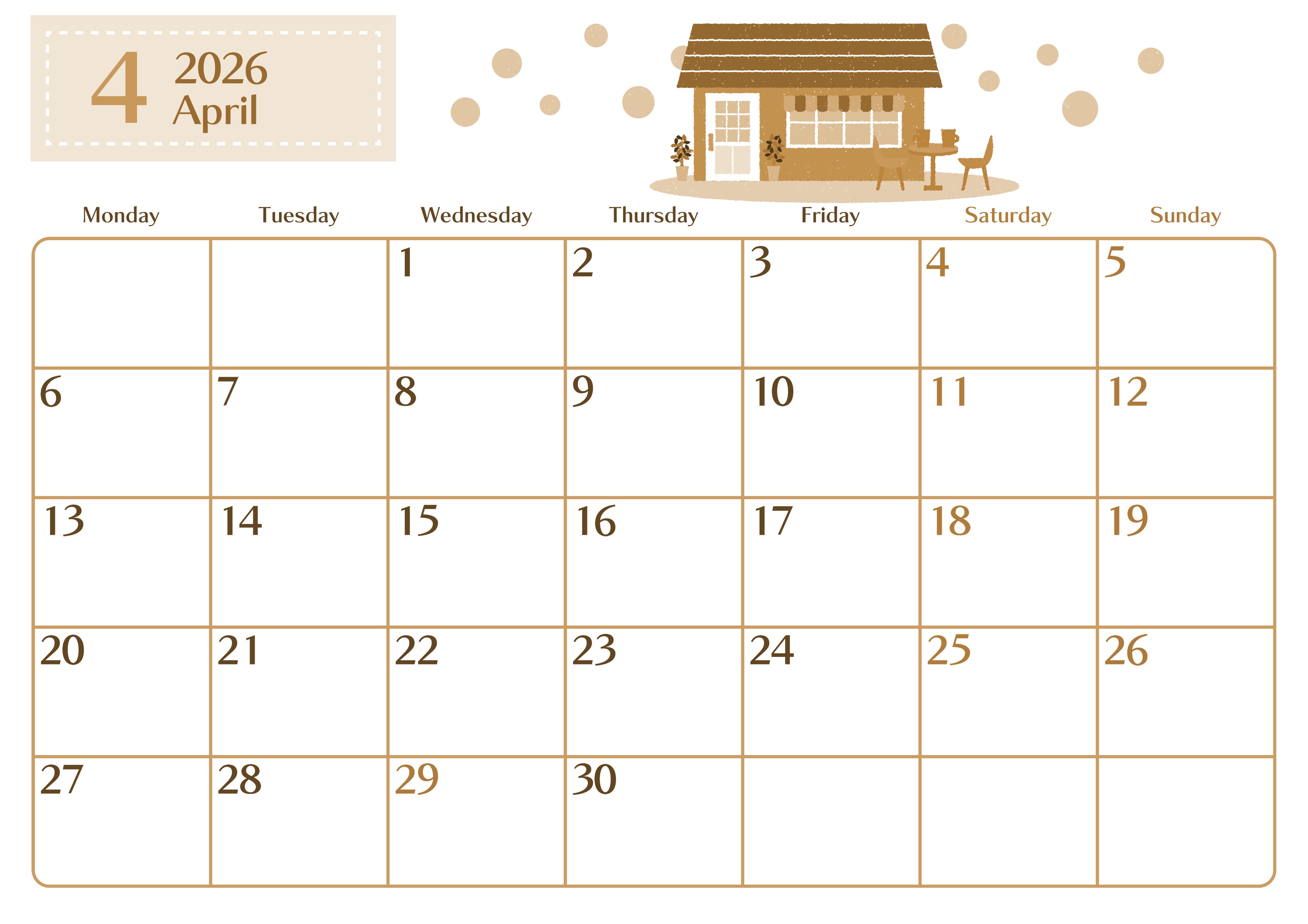 2026年4月横型レトロな月曜始まりの無料テンプレートセピア調カレンダーです。上品でおしゃれなフォントが特徴のセピア調カレンダー部分が見やすいのはもちろん、イラスト部分の一軒家が小綺麗で快適な新生活に期待感を高めてくれるような使いたくなるデザインです。(2026-00730401)