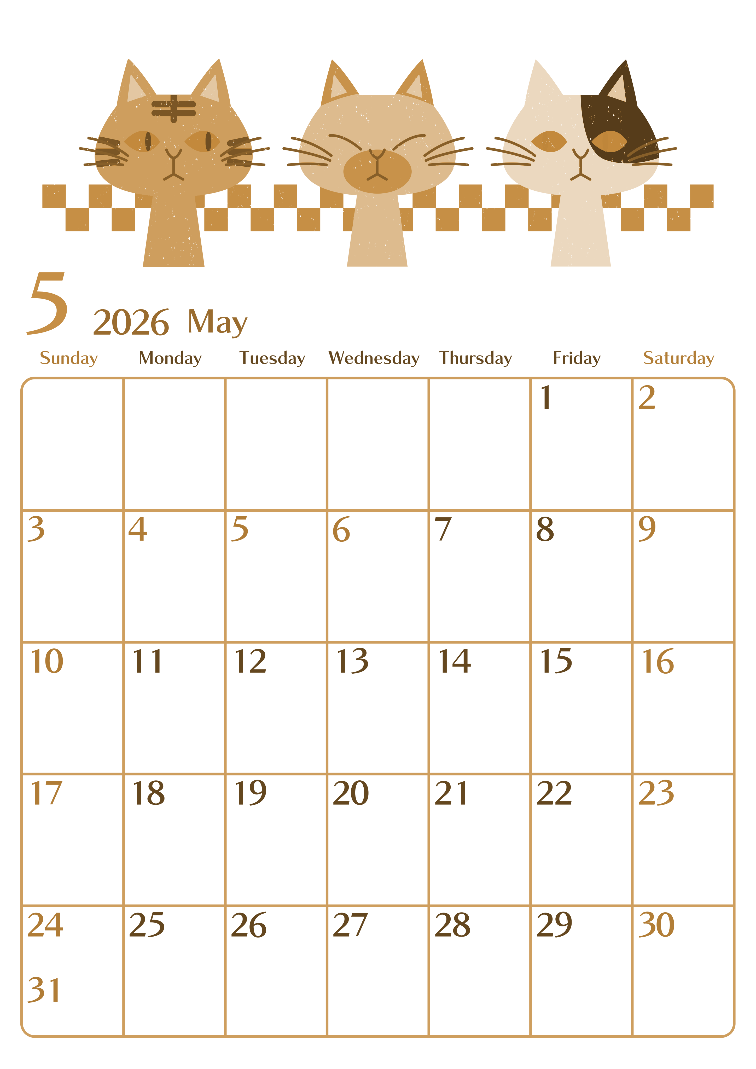2026年5月縦型レトロな日曜始まり 猫たちイラストのおしゃれA4無料セピア調カレンダー(2026-00730510)