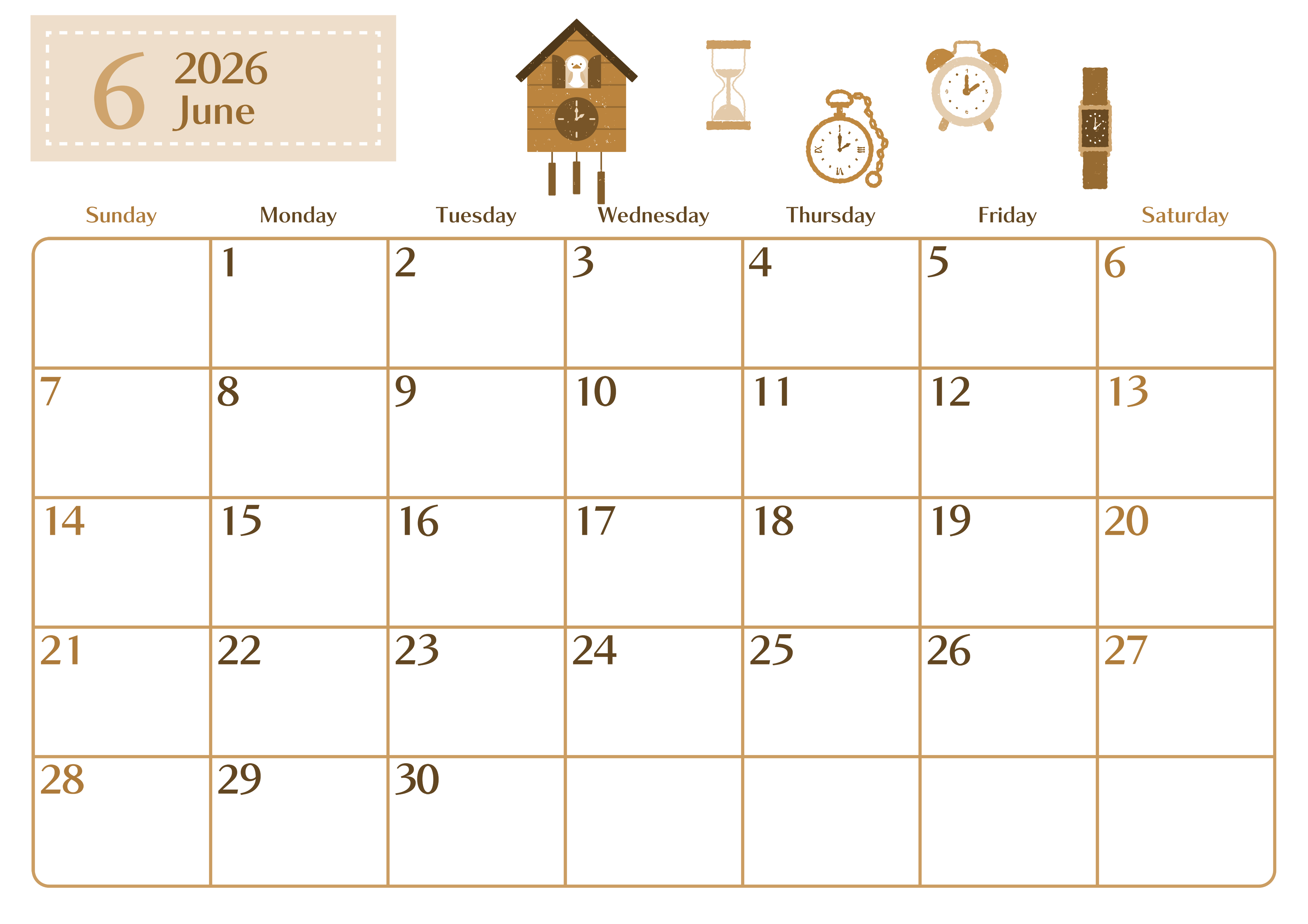 2026年6月横型レトロな日曜始まりの無料テンプレートセピア調カレンダーです。いろいろな形状の時計のイラストがちりばめられていてスタイリッシュでおしゃれなイラストのセピア調カレンダーが毎日を丁寧な生活に招き入れてくれます。(2026-00730600)