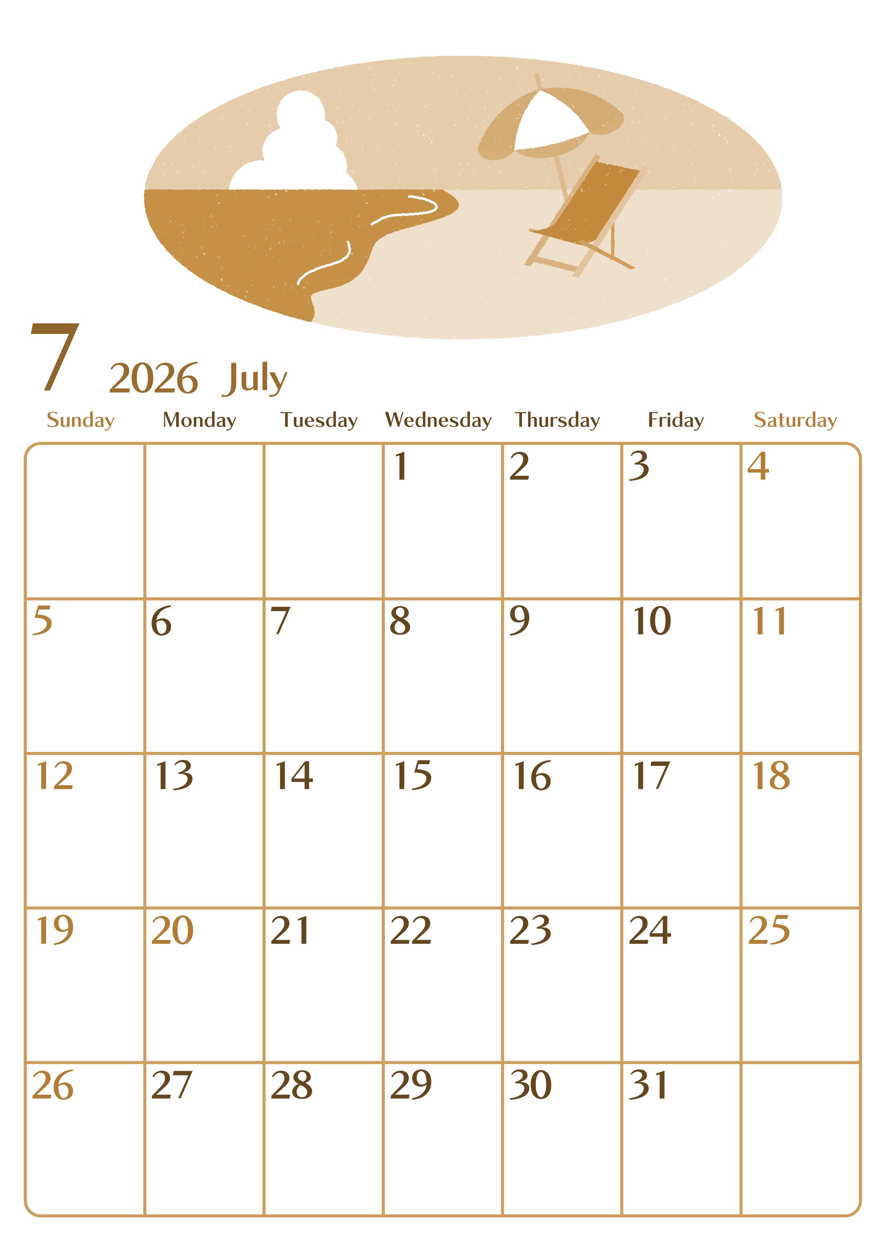 2026年7月縦型レトロな日曜始まりの無料テンプレートセピア調カレンダーです。南国 バカンスをテーマにしたおしゃれなイラストが添えらえれている縦型でスケジュールをたっぷり書き込めるようなレイアウトのフリー素材です。(2026-00730710)