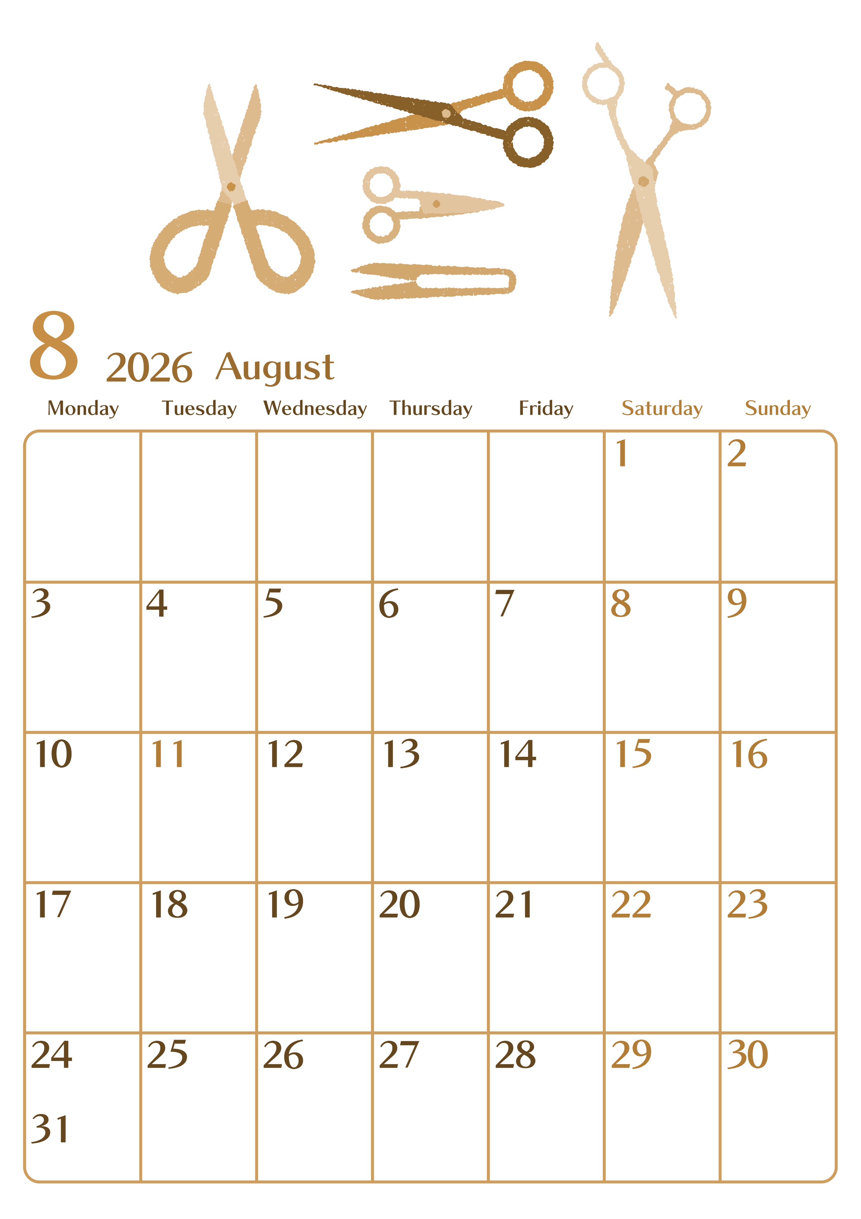 2026年8月縦型レトロな月曜始まり ハサミイラストのおしゃれA4無料セピア調カレンダー(2026-00730811)