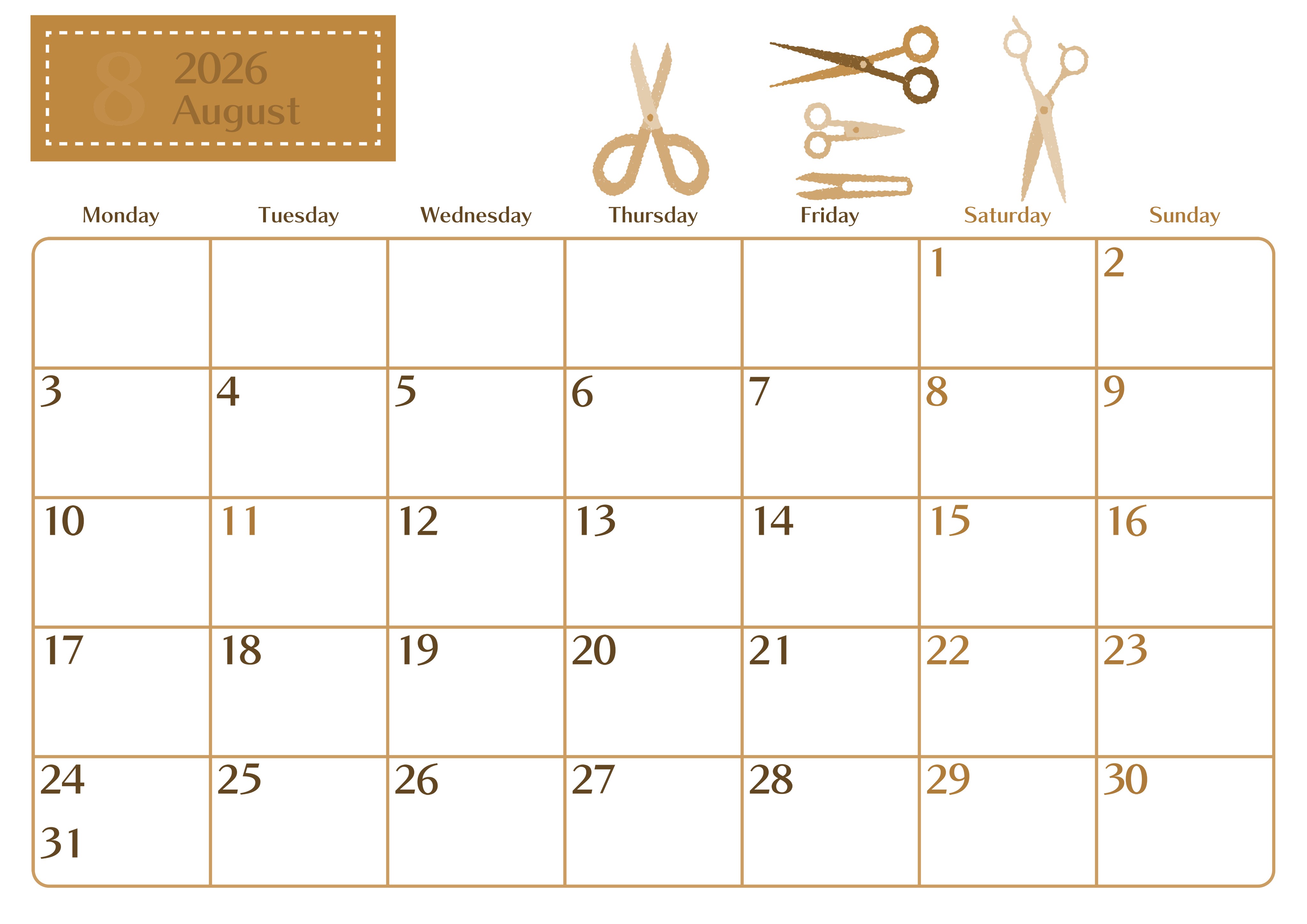 2026年8月横型レトロな月曜始まり ハサミイラストのおしゃれA4無料セピア調カレンダー(2026-00730801)