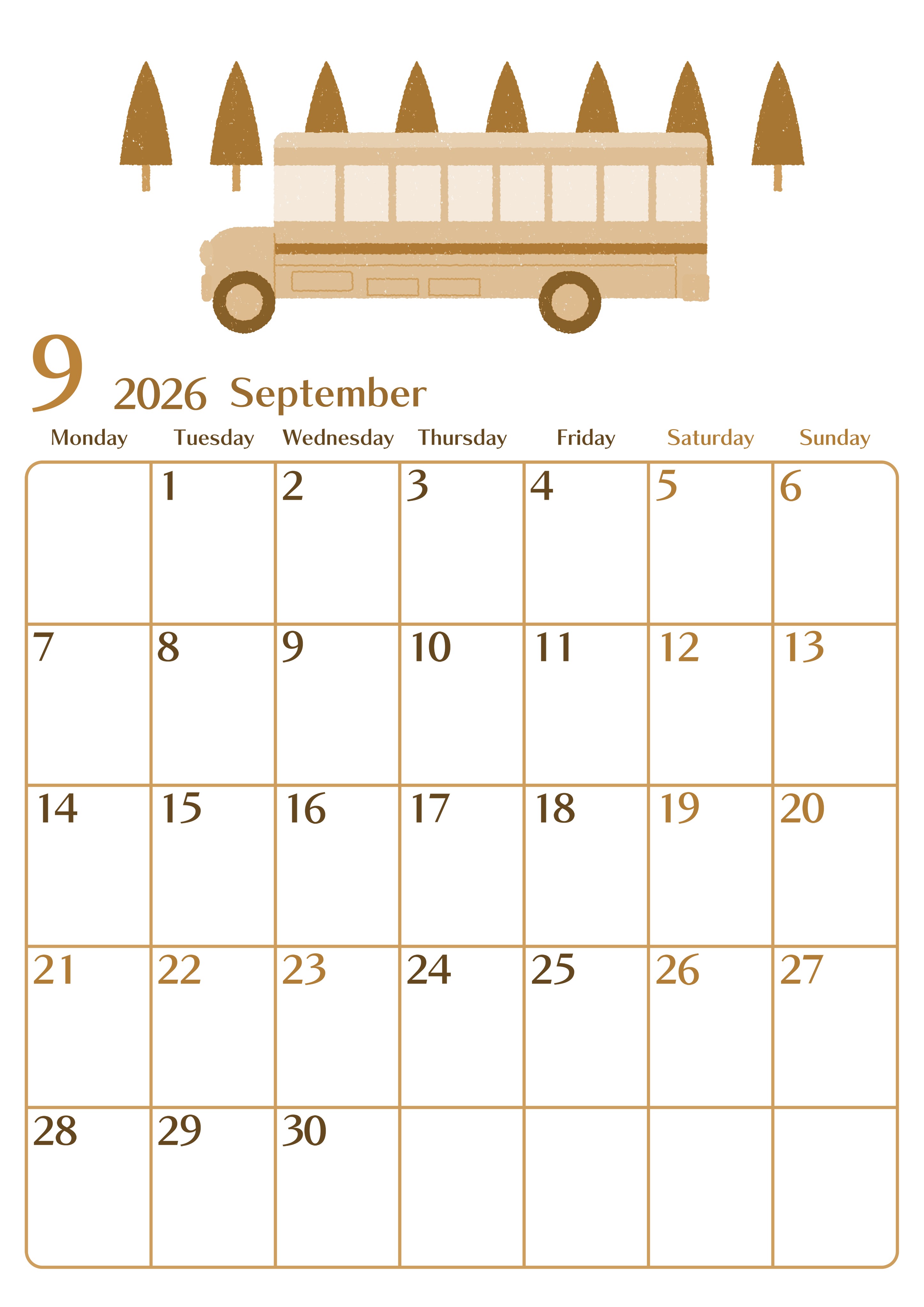 2026年9月縦型レトロな月曜始まりの無料テンプレートセピア調カレンダーです。新学期の勉強の予定を整理整頓して書き込むのにも向いているだけでなく、セピア調カレンダー上部のバスのイラストがおとなっぽいおしゃれさを醸し出しています。(2026-00730911)