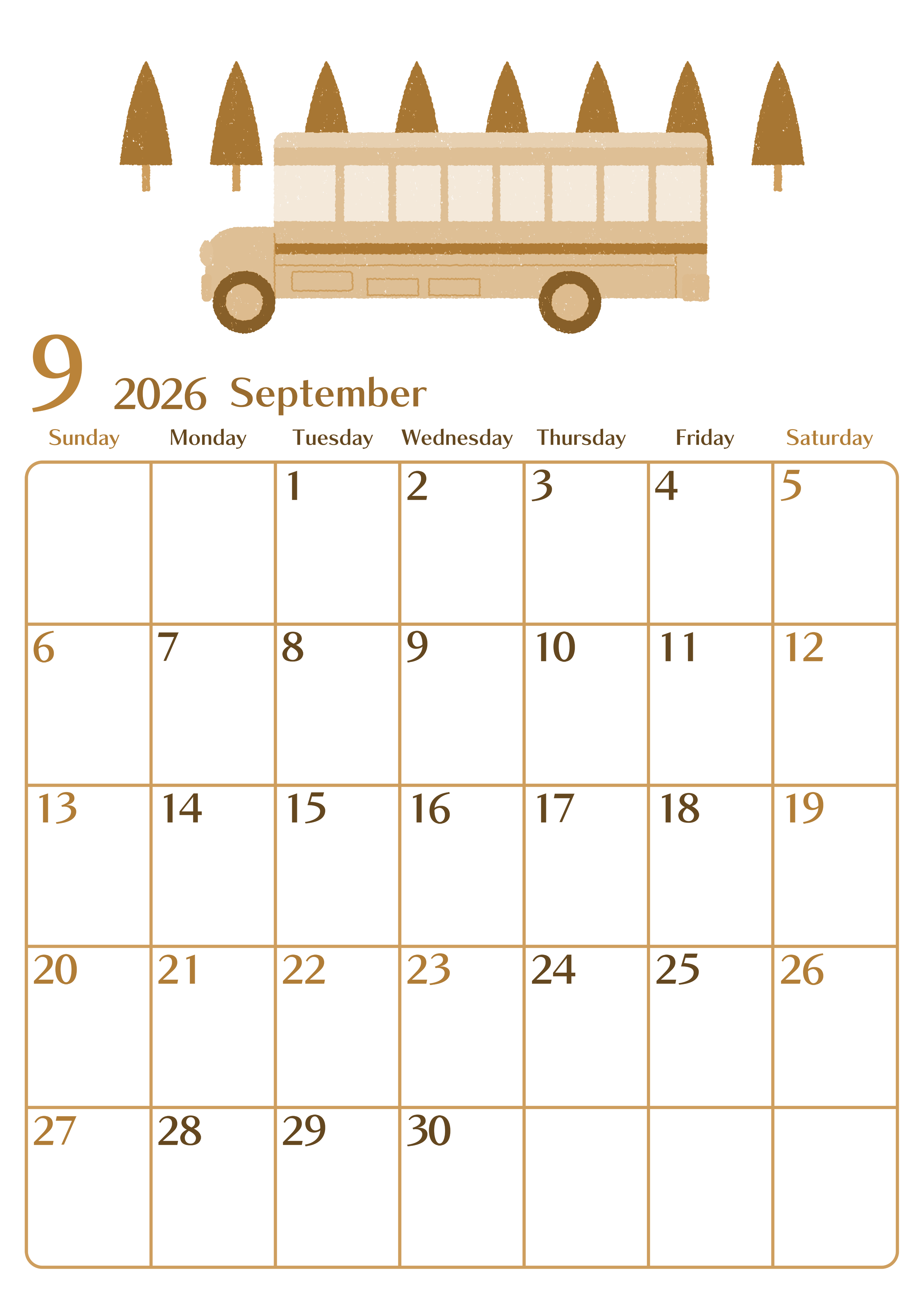 2026年9月縦型レトロな日曜始まり バスイラストのおしゃれA4無料セピア調カレンダー(2026-00730910)