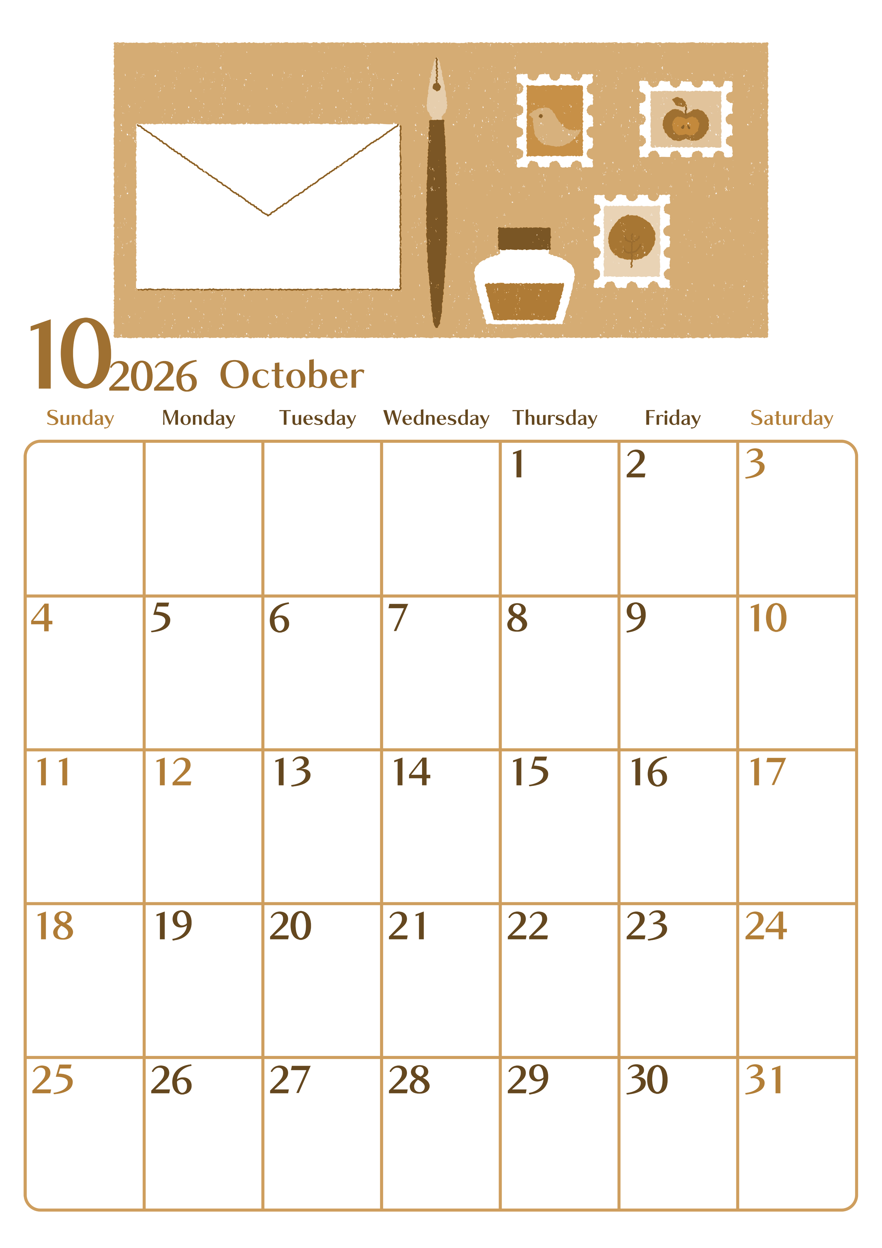 2026年10月縦型レトロな日曜始まりの無料テンプレートセピア調カレンダーです。縦型レトロなセピア調カレンダーなのでA4用紙に印刷をして壁に貼って使うのにとても向いている素材です。手紙のイラストもおしゃれなので老若男女問わず使えます。(2026-00731010)